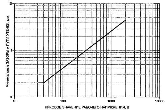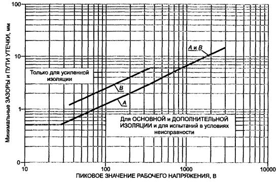 Сопрягаемый участок испытательной вилки - в соответствии с рисунком 7 МЭК 60169-2. Примечание - См. 12.5. Рисунок 8 - Испытательный штекер для механических испытаний антенных коаксиальных соединителей Примечания 1 Указанные значения применяются к ОСНОВНОЙ, ДОПОЛНИТЕЛЬНОЙ и УСИЛЕННОЙ ИЗОЛЯЦИЙ. 2 Для ОСНОВНОЙ, ДОПОЛНИТЕЛЬНОЙ и УСИЛЕННОЙ ИЗОЛЯЦИЙ предполагается, что все детали цепи, НЕПОСРЕДСТВЕННО СОЕДИНЕННОЙ С СЕТЬЮ, находятся под напряжением не менее номинального напряжения СЕТИ по отношению к земле. Для деталей, непосредственно соединенных с СЕТЬЮ напряжением от 220 до 250 В (эффективное значение), размеры выбирают под напряжением 354 В (пиковое значение). 3 Напряжение, приложенное к ОСНОВНОЙ ИЗОЛЯЦИИ, определяют при закорачивании ДОПОЛНИТЕЛЬНОЙ ИЗОЛЯЦИИ и наоборот. 4 Для напряжений, превышающих 4000 В (пиковое значение) переменного или постоянного тока, при испытании с напряжением по 10.3 в условиях неисправности необходимо ввести короткое замыкание ВОЗДУШНЫХ ЗАЗОРОВ или ПУТЕЙ УТЕЧКИ. 5 Кривые построены, исходя из следующего: Кривая А: 35 В соответствуют 0,6 мм; 354 В соответствуют 3,0 мм. Кривая В: 35 В соответствуют 1,2 мм; 354 В соответствуют 6,0 мм. 6 Если провода, имеющие лаковые покрытия, выдержат испытательное напряжение, установленное для 2-й степени или выше по МЭК 60317, считается, что это способствует уменьшению на 1 мм минимальных значений ВОЗДУШНЫХ ЗАЗОРОВ и ПУТЕЙ УТЕЧКИ, установленных в 13.1.1. 7 Установленные ВОЗДУШНЫЕ ЗАЗОРЫ и ПУТИ УТЕЧКИ являются минимально существующими разделениями с учетом точности в сборках и деталях. 8 См. раздел 13. Рисунок 9 - Величины ВОЗДУШНЫХ ЗАЗОРОВ и ПУТЕЙ УТЕЧКИ Кривую рассчитывают по формуле log d= 0,78 log (V/300), где d - расстояние (при минимальном расстоянии зазора и пути утечки, равном 0,2 мм); V - пиковое значение рабочего напряжения, В. Примечание - См. 13.2. Рисунок 10 - Минимальные расстояния ЗАЗОРОВ и ПУТЕЙ УТЕЧЕК для печатных плат Примечание - См. 15.4.1. Рисунок 11 - Установка для испытаний устройств, составляющих часть СЕТЕВОЙ вилки Размеры в миллиметрах Рисунок 12 - Образец царапин для испытаний на взрывоопасность Рисунок 13 - Расстояния от ПОТЕНЦИАЛЬНЫХ ИСТОЧНИКОВ ВОСПЛАМЕНЕНИЯ. Лист 1