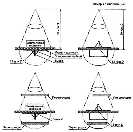 Соответствие требованию проверяют обследованием, измерением и 10-кратным воздействием на аппарат, сборочный узел или компонент при следующем температурном цикле: 68 ч - при (Y±2) °С; 1 ч - при (25±2) °С; 2 ч - при (0±2) °С; 1 ч - при (25 ±2) °С, где Y - максимальная температура, измеренная при нормальных условиях эксплуатации на исследуемом аппарате, компоненте или сборочном узле, но не менее 85 °С. В случае трансформаторов Y является максимальной температурой обмотки, измеренной при нормальных условиях эксплуатации, плюс 10 К, но не менее 85 °С. Затем аппарат, сборочный узел или компонент подвергают испытаниям на электрическую прочность по 10.3. Испытания проводят на трех образцах. После испытаний не должно быть никаких повреждений. 13.4 Расстояния между проводящими частями внутри аппарата, сборочного узла, компонента, которые обработаны изолирующим компаундом, заполняющим все пустоты таким образом, что не остается ЗАЗОРОВ и ПУТЕЙ УТЕЧЕК, должны удовлетворять только требованиям 8.8. Примечание - Примерами такой обработки являются заливка, инкапсуляция и вакуумная пропитка. Соответствие требованию проверяют по 13.3 с учетом требований 8.8 и следующих условий: при визуальном обследовании не должно быть обнаружено никаких трещин в герметизациях, пропитках или других материалах, покрытие не должно иметь ослаблений или усадок и после секционирования образца не должно быть значительных пустот в материале. 13.5 Для покрытых ПЕЧАТНЫХ ПЛАТ типа В изоляция между проводниками должна удовлетворять требованиям МЭК 60664-3. Это требование относится только к ОСНОВНОЙ ИЗОЛЯЦИИ. Примечание - Для указанных ПЕЧАТНЫХ ПЛАТ ЗАЗОРОВ и ПУТЕЙ УТЕЧЕК под покрытием не существует. 14 КомпонентыПримечания 1 Если значения параметров компонентов являются частью диапазона значений, то нет необходимости проводить испытания каждого значения этого диапазона. Если этот диапазон состоит из технологически однородных поддиапазонов, то испытаниям подвергают образцы из каждого поддиапазона. Кроме того, если это возможно, то рекомендуется использовать понятие структурно подобных компонентов. 2 Если требуется определенная категория огнестойкости в соответствии с МЭК 60707, то в приложении G даны ссылки в отношении выбора альтернативных методов испытаний. 3 Если требования на огнестойкость в настоящем разделе отсутствуют, то дают ссылку на 20.1.1. Резисторы, короткое замыкание или обрыв которых вызывает нарушение требований безопасности при работе в условиях неисправностей (см. раздел 11), а также резисторы, шунтирующие промежутки между контактами СЕТЕВЫХ выключателей, должны иметь достаточно стабильное значение сопротивления в режиме перегрузки. Такие резисторы должны размещаться внутри корпуса аппарата. Соответствие требованию проверяют испытаниями согласно перечислению а) или б), проводимыми на партии из 10 образцов резисторов. Перед началом испытаний по перечислению а) или б) должны быть измерены значения сопротивления каждого образца, после чего всю партию подвергают воздействию влажного тепла по МЭК 60068-2-3 в течение 21 сут. а) Резисторы, подключенные между ОПАСНЫМИ ДЛЯ ЖИЗНИ частями и ДОСТУПНЫМИ проводящими частями, а также резисторы, шунтирующие промежуток между контактами СЕТЕВЫХ выключателей, необходимо подвергнуть воздействию 50 разрядов, проводимых с максимальной скоростью 