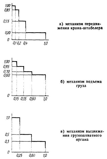 __________ * Для таких сочетаний параметров крана-штабелера и проектной длины стеллажа, при которых время подъема груза на полную высоту равно или превышает время передвижения в конец стеллажа. 2.1.2. 90 %-ный ресурс механизмов должен быть не менее указанного в табл. 2 общего времени работы механизма. Если для механизма предусматривается капитальный ремонт, то указанный ресурс исчисляется до капитального ремонта. 2.1.3. Циклограммы для расчета механизмов приведены на черт. 1, где по оси абсцисс отложено относительное количество циклов, по оси ординат - относительное значение нагрузки. Черт. 1 Абсолютное значение количества циклов определяется как частное от деления необходимого ресурса (п. 2.1.2) на длительность одного цикла при установившемся движении (для вращающихся элементов циклом является один оборот). Абсолютное значение наибольшей ординаты нагрузки для механизма передвижения соответствует моменту при разгоне с расчетным ускорением; для механизма подъема - моменту при установившемся движении подъема с номинальным грузом; для механизма выдвижения - при взятии номинального груза из ячейки стеллажа, т.е. на наибольшем вылете захвата, но без учета сил инерции. 2.1.4. Электродвигатели должны быть проверены по наибольшим нагрузкам пусковых и тормозных режимов, а также на нагрев с учетом данных табл. 2 и черт. 1. 2.1.5. Элементы механизмов должны быть проверены на прочность по наибольшим нагрузкам пусковых и тормозных режимов, а также на выносливость (или долговечность) с учетом п. 2.1.2 и черт. 1. При этом расчет цилиндрических эвольвентных зубчатых передач внешнего зацепления следует выполнять по ГОСТ 21354, выбор зубчатых муфт - по ГОСТ 5006. Коэффициент запаса прочности и выносливости валов должен быть не менее 1,5; необходимые для расчета характеристики сопротивления усталости следует определять по ГОСТ 25.504. 2.2. Механизм передвижения крана-штабелера 2.2.1. Сопротивление передвижению крана-штабелера определяется как сила, необходимая для преодоления трения качения ходовых колес и подшипников, умноженная на коэффициент 1,1, учитывающий трение в боковых роликах. Уклон пути не учитывается. Коэффициент трения шариковых и роликовых подшипников назначается равным 0,015. Коэффициент трения качения назначается равным 0,4 мм для колес диаметром не более 320 мм; 0,6 мм - для колес диаметром более 320 мм и не более 560 мм; 0,8 мм - для колес диаметром более 560 мм и не более 700 мм; 1,0 мм - для колес диаметром более 700 мм. При этом грузоподъемник устанавливается в крайнее верхнее положение; горизонтальные инерционные силы, соответствующие расчетному ускорению (замедлению), вводятся в расчет без динамического коэффициента, а их направление назначается соответствующим разгрузке приводных колес. Коэффициент сцепления колеса с рельсом принимается равным 0,20. Для кранов-штабелеров с гибким токоподводом следует дополнительно учесть воздействие усилий статического натяжения и сопротивления передвижению кабельной подвески, если эти усилия вызывают разгрузку приводного колеса. При этом кабельную подвеску следует рассматривать в наиболее растянутом положении. 2.2.3. При расчете коэффициента запаса сцепления массы крана-штабелера и груза принимаются в своем номинальном значении. Все прочие расчеты выполняются при значении массы-штабелера 1,05 от номинальной и массы груза 1,1 от н