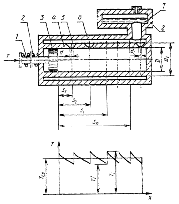 1. Рассматриваемая конструкция (черт. 5) состоит из рабочего цилиндра 4, по образующей которого просверлен ряд конусообразных отверстий 5, поршня 3 со штоком 1, наружного цилиндра 6, возвратной пружины 2 и резервуара 8. Внутренние полости рабочего 4 и наружного 6 цилиндров и частично резервуара 8 заполнены жидкостью 7.
