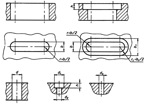 1.8 Основные размеры сквозных отверстий и пазов под крепежные детали (кроме отверстий в шпонках) должны соответствовать указанным на рисунке 3 и в таблице 7, отверстий в шпонках - на рисунке 3 и в таблице 8. Рисунок 3 Таблица 7 В миллиметрах