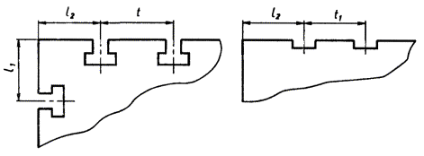 1.9 Расстояния от базовой плоскости до оси Т-образного паза (l, l1), между смежными Т-образными пазами (t), от базовой плоскости до оси П-образного паза (l2), между смежными П-образными пазами (t1) должны соответствовать указанным на рисунке 4 и в таблице 9. Рисунок 4 Таблица 9 В миллиметрах