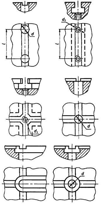 1.10 Расстояния от базовой плоскости до оси отверстий (резьбовых, гладких) для крепления шпонок (l), от оси отверстий для крепления шпонок до оси отверстий под крепежные детали (l1) должны соответствовать указанным на рисунке 5 и в таблице 10. Рисунок 5 Таблица 10 В миллиметрах