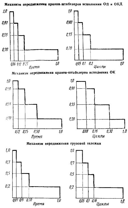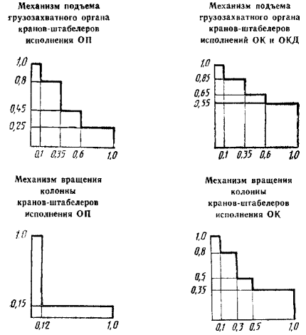1.6. Прочность кранов-штабелеров, рассчитанная в соответствии с требованиями настоящего стандарта, достаточна для использования их в сейсмических районах без ограничений (учет сейсмических нагрузок не требуется). 2. ОСНОВЫ РАСЧЕТА МЕХАНИЗМОВ2.1. Общие положения 2.1.1. Расчетные характеристики режима работы механизмов приведены в табл. 2. Расчетные циклограммы загрузки механизмов приведены на черт. 1 и 2, где по оси абсцисс отложено относительное число циклов или относительная продолжительность действия нагрузки, по оси ординат - относительное значение нагрузки. Абсолютное значение продолжительности действия нагрузки определяется исходя из общего времени работы механизмов (табл. 2) с учетом пп. 2.1.2 и 2.1.3. Абсолютное значение числа циклов определяют как частное от деления абсолютной продолжительности действия нагрузки на длительность одного цикла при установившемся движении (для вращающихся элементов-валов, шестерен, подшипников и т.п. - циклом является один оборот или же часть его для элементов планетарных передач). Полученное значение корректируют понижающим коэффициентом: 0,8 - для механизма передвижения кранов-штабелеров исполнения ОП и механизма передвижения грузовой тележки всех исполнений; 0,7 - для механизма передвижения кранов-штабелеров исполнения ОК; 1,0 - для прочих механизмов. Наибольшая ордината нагрузки для механизмов передвижения крана-штабелера и грузовой тележки, а также для механизма вращения колонны кранов-штабелеров исполнения ОП соответствует моменту при разгоне с расчетным ускорением. Таблица 2