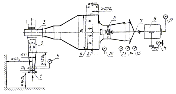 Срок действия с 01.01.83 до 01.01.95 Несоблюдение стандарта преследуется по закону Настоящий стандарт распространяется на крышные осевые вентиляторы (далее - вентиляторы), одноступенчатые, с вертикально расположенной осью вращения, с диаметрами рабочих колес от 200 до 1600 мм, предназначенные для удаления непосредственно из помещений промышленных и общественных зданий (без сети воздуховодов) воздуха и других газовоздушных невзрывоопасных смесей, агрессивность которых по отношению к углеродистым сталям обыкновенного качества не выше агрессивности воздуха, и температура не выше 40 °С, которые не содержат липких веществ и волокнистых материалов и в которых содержание пыли и других твердых примесей не более 10 мг/м3. Климатическое исполнение вентиляторов - У, Т, категория размещения 1 по ГОСТ 15150-69. Стандарт не распространяется на вентиляторы в специальном исполнении (взрывозащищенные, коррозионностойкие и др.). (Измененная редакция, Изм. № 1). Требования пп. 1.5, 2.1.7, 6.1.4, 6.3 и разд. 3 настоящего стандарта являются обязательными, другие требования - рекомендуемыми. (Измененная редакция, Изм. № 2). 1. ОСНОВНЫЕ ПАРАМЕТРЫ И РАЗМЕРЫ1.1. Производительность Q вентиляторов должна находиться в пределах от 0,5×103 до 100×103 м3/ч на рабочем режиме при статическом давлении psv = 0. 1.2. Аэродинамические качества вентиляторов должны оцениваться по размерным или безразмерным аэродинамическим показателям, определяемым на основании аэродинамических испытаний в рабочем режиме. Определение аэродинамических показателей дано в приложении. 1.3. Удельная