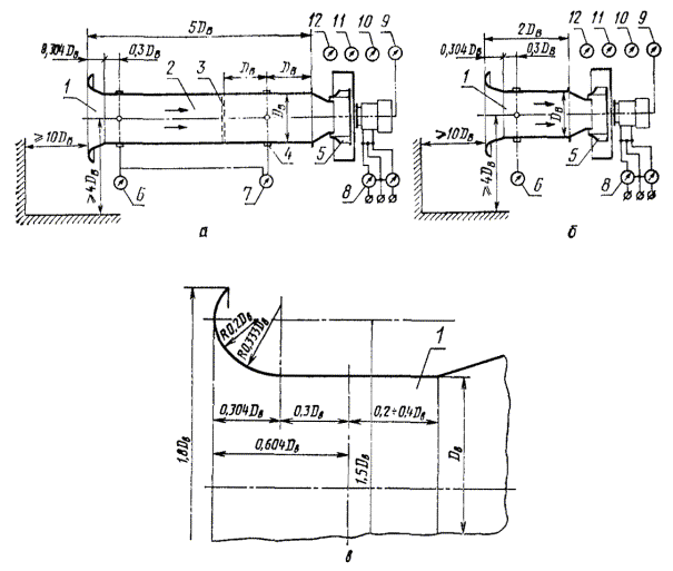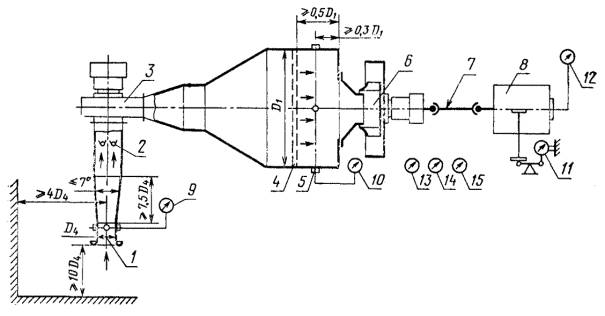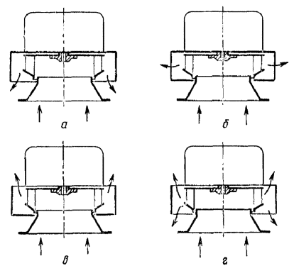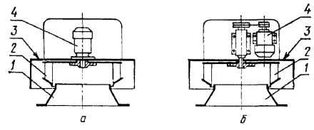 Черт. 1 1.4. Акустические качества вентиляторов должны оцениваться по шумовым характеристикам (ГОСТ 12.2.028-84) на основании акустических испытаний вентиляторов в номинальном режиме работы раздельно на всасывании и нагнетании. При испытании со стороны нагнетания должен учитываться шум, излучаемый через выходное отверстие и корпус вентилятора. 1.3, 1.4. (Измененная редакция, Изм. № 2). 1.5. Суммарные уровни звуковой мощности вентиляторов не должны превышать значений, приведенных на черт. 1, более чем на 5 дБ. (Измененная редакция, Изм. № 1). 1.7. Номинальные значения диаметров рабочих колес по внешним кромкам лопаток должны выбираться из следующего ряда: 200, 250, 315, 400, 500, 630, 800, 1000, 1250, 1600 мм. (Измененная редакция, Изм. № 1). 1.8. Габаритные, присоединительные и установочные размеры вентиляторов - по техническим условиям на конкретные вентиляторы. Черт. 2 1.9. По конструктивным признакам вентиляторы подразделяют: в зависимости от направления выхода воздуха: с выходом вниз (черт. 2, а), в стороны (черт. 2, б), вверх (черт. 2, в), вверх и вниз (черт. 2, г); в зависимости от способа привода: с установкой рабочего колеса непосредственно на вал электродвигателя (черт. 3, а), с приводом посредством клиноременной передачи (черт. 3, б); в зависимости от способа передачи динамических усилий на поддерживающие конструкции: виброизолированные, невиброизолированные. 1 - входной патрубок; 2 - рабочее колесо; 3 - корпус; 4 - электродвигатель Черт. 3 1.10. (Исключен, Изм. № 1). 2. ТЕХНИЧЕСКИЕ ТРЕБОВАНИЯ2.1. Требования к конструкции 2.1.1. Вентиляторы должны изготовлять в соответствии с требованиями настоящего стандарта и технических условий на конкретные вентиляторы. 2.1.3. Конструкцией вентиляторов должно быть обеспечено постоянство зазора между входным патрубком и рабочим колесом, а также защита виброизолированной части от ветровых нагрузок. 2.1.4. Вентиляторы должны иметь специальные приспособления для захвата грузоподъемными средствами. 2.1.5. Для доступа к элементам, требующим периодического наблюдения и обслуживания, должны быть предусмотрены люки с легкосъемными крышками или другие подобные устройства. 2.1.6. Значения удельной остаточной неуравновешенности рабочих колес и шкивов должны устанавливаться организацией-разработчиком конструкторской документации, исходя из допустимого среднего квадратического значения виброскорости, частоты вращения рабочего колеса и способа привода вентилятора. (Измененная редакция, Изм. № 2). (Введен дополнительно, Изм. № 2). 2.2. Требования по устойчивости к внешним воздействиям 2.2.2. Наружные и внутренние поверхности вентиляторов должны иметь защитные лакокрасочные покрытия класса V по ГОСТ 9.032-74 группы У1 по ГОСТ 9.104-79. Покрытию не подлежат посадочные поверхности, канавки шкивов, таблички, а также покупные изделия, имеющие окраску, и изделия из пластмасс. Значения вибрационной нагрузки и методы проверки вибрационной прочности должны быть заданы в технических условиях на вентиляторы конкретных типов. средний срок службы - не менее 12 лет; средний ресурс до капитального ремонта - не менее 23000 ч; наработка на отказ - не менее 15000 ч. Установленная безотказная наработка - не менее 3000 ч, установленный ресурс до капитального ремонта - 6000 ч. 2.2.3, 2.3. (Измененная редакция, Изм. № 1). 3. ТРЕБОВАНИЯ БЕЗОПАСНОСТИ3.1. Конструкция вентиляторов должна отвечать общим требованиям без