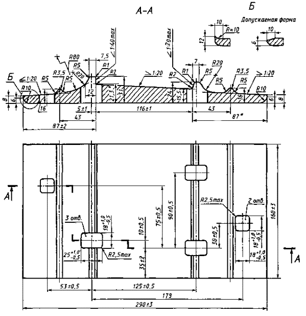 * Размеры для справок. Примечание. Предельные отклонения размеров отверстий указаны со стороны продавливания. Условное обозначение подкладки типа Д43: Подкладка Д43 ГОСТ 7056-77 |