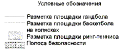 Рис. 7. Схемы разметки площадок для гандбола, баскетбола на колясках, ринг-тенниса для занятий инвалидов с поражением опорно-двигательного аппарата в зале спортивных игр 45´24 м. Экспликация. 1. Гимнастическая стенка. 2. Тренажер «Стенка». 3. Тренажер «Гребля». 4. Тренажер «Ритм». 5. Место инструктора. 6. Дорожка для бега. 7. Велотренажер «Здоровье». 8. Станок напольный для упражнений в ходьбе. 9. Ковер. 10. Снаряды гимнастические подвесные. 11. Рукоход. 12. Гимнастическая стенка. 13. Гимнастическая скамейка. 14. Зеркало. 15. Станок пристенный. Рис. 8. Варианты расстановки оборудования залов общефизической подготовки физкультурно-оздоровительных центров жилых районов с учетом занятий инвалидов-опорников. А. Зал 18´9 м. Б. Зал 21´12 м. Рис. 9. Схемы размещения площадок для учебно-тренировочных занятий восточными единоборствами в зале 24´15 м. Экспликация. 1. Стоп для игры в шоу-даун. 2. Зоны безопасности. Рис. 10. Схема размещения оборудования в зале 12,0´8 м для игры в шоу-даун инвалидов с поражением зрения. Экспликация 1. Ванна оздоровительного плавания 16,6´6,0 м. 2. Стационарные сиденья с подогревом. 3. Места хранения колясок. 4. Площадка для гимнастики. 5. Подъемник. 6. Поручни. 7. Входы из раздевальных с местами для инвалидов. 8. Лестница в мелкой части бассейна. 9. Лестница в глубокой части бассейна. Рис. 11. А. Схема зала бассейна с ванной оздоровительного плавания размером 16,6´6 м (с учетом обеспечения занятий инвалидов-опорников). Б. Схема лестницы в мелкой части бассейна. Экспликация 1. Коридор. 2. Вход в раздевальную. 3. Скамейка. 4. Поручни. 5. Выход в зал бассейна. 6. Душ. 7. Раковина. 8. Туалет. 9. Шкафчики для хранения одежды. 10. Места для колясок. 11. Зал бассейна. Рис. 12. Примеры планировок семейных раздевальных для инвалидов с сопровождением. А. Раздевальная для инвалидов в спортцентре (Вайкоум, Великобритания). Б. Проект семейной раздевальной со сквозным проходом в ванну бассейна. Экспликация 1. Приемная. 2. Кабинет врача. 3. Процедурная. 4. Кабинет механотерапии. 5. Кабинет лечебной гимнастики. 6. Зал лечебной гимнастики. 7. Кабинет тестирования с физической нагрузкой. 8. Кабинет аутотренинга. 9. Кабинет электро- и светолечения. 9а. Индивидуальные кабины электро- и светолечения. 9б. Помещение для обработки прокладок. 10. Массажная 10а. Индивидуальные массажные кабины. 10б. Раздевальная. 10в. Душевая. 11. Сауна. 11а. Камера сухого жара на 6 чел. 11б. Комната отдыха. 11в. Пульт управления. 11г. Микробассейн. 11д. Раздевальная с душевой и туалетом. 11е. Кладовая грязного и чистого белья. 11ж. Комната персонала сауны с кладовой. 12. Кабинет гидропатии. 12а. Кафедра с душевыми установками. 12б. Раздевальные душевого зала. 13. Кабинет подводного массажа. 14. Комната персонала. 15. Кладовая грязного и чистого белья. 16. Кладовая уборочного инвентаря. 17. Санузел. Рис. 13. Функциональная схема медико-восстановительного центра. Экспликация 1. Стол инструктора. 2. Шведская стенка. 3. Скамейка гимнастическая. 4. Зеркало. 5. Коврики (маты) для выполнения упражнений в положении лежа. 6. Шкаф для гимнастического оборудования. 7. Скамейки с крючками для переодевания. 8. Туалет. 9. Душевая кабина. 10. Места установки аппаратов механотерапии. 11. Стол врача. 12. Смотровая кушетка. 13. Умывальник. 14. Шкаф медицинский. 15. Электрокардиограф. 16. Спирограф. 17. Велоэргометр. 18. Фонограф. 19. Душевая кабина. 20. Уборная. 21. Зона разворота инвалидной коляски. Рис. 14. Схе