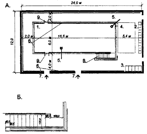 *) В числителе дроби показатели для хранения беговых лыж, в знаменателе - горных. 1. Вестибюль, гардероб. 2. Раздевальные, душевые залов. 3. Универсальный игровой спортивный зал. 4. Зал физкультурно-оздоровительных занятий. 5. Зал аэробики-хореографии, худ. гимнастики. 6. Зал борьбы, тренажерный зал. 8. Зал для игры в шоу-даун. 9. Инвентарная. 10. Ванна спортивно-оздоровительного плавания 11. Раздевальные бассейна. 12. Душевые бассейна. 13. Семейные раздевальные инвалидов. 14. Зал подготовительных занятий. 15. Комната дежурного инструктора. 16. Комната дежурной медсестры. 17. Раздевальные детской ванны. 18. Душевые детской ванны. 19. Детская ванна 20. Эксплуатационные службы. 21. Технические помещения. 22. Лаборатория. 23. Инвентарная открытых сооружений. 24. Раздевальные открытых сооружений. 25. Туалет. 26. Буфет. 27. Регистратура, касса. 28. Пункт проката спортинвентаря. 29. Администрация. 30. Тренерская. 31. Бытовые помещения. 32. Хозяйственная кладовая. 33. Помещения досугового назначения. 34. Помещения медико-оздоровительного центра. 35. Помещения методического центра. Рис. 1. Функциональная схема физкультурно-оздоровительного центра жилого района на 30,0 - 50,0 тыс. жителей (компактное размещение). Экспликация помещений 1. Вестибюль, гардероб. 2. Раздевальные командные. 3. Универсальный игровой спортивный зал. 4. Инвентарная. 5. Тренажерный зал. 6. Зрительская галерея. 7. Помещения досугового назначения. 8. Администрация. 9. Тренерская. 10. Бытовые помещения. 11. Хозяйственная кладовая. 12. Медпункт. 13. Туалет. 14. Буфет. 15. Регистратура, касса. 16. Раздевальные залов общие. 17. Зал физкультурно-оздоровительных занятий. 18. Зал аэробики-хореографии, художественной гимнастики. 19. Зал борьбы. 20. Зал для игры в шоу-даун. 21. Помещения методического назначения. 22. Технические помещения. Рис. 2. Функциональные схемы корпусов физкультурно-спортивных залов при рассредоточенном размещении крытых сооружений физкультурно-оздоровительного центра жилого района. А. Корпус универсального зала. Б. Корпус специализированных залов. Экспликация помещений 1. Вестибюль, гардероб. 2. Раздевальные. 3. Душевые. 4. Зал подготовительных занятий. 5. Учебно-тренировочная ванна 25´16 м. 6. Инвентарная. 7. Комната дежурной медсестры. 8. Комната дежурного инструктора. 9. Лаборатория. 10. Технические помещения. 11. Эксплуатационные службы. 12. Методический кабинет. 13. Хранение учебных пособий. 14. Тренерская. 15. Администрация. 16. Бытовые помещения. 17. Хозяйственная кладовая. 18. Буфет. 19. Туалет. 20. Холл /комната отдыха. 21. Медицинский кабинет. 22. Раздевальные детской ванной. 23. Душевые детской ванны. 24. Детская ванна. Рис. 3. Функциональная схема корпуса бассейна с ванной спортивно-оздоровительного плавания при рассредоточенном размещении крытых сооружений физкультурно-оздоровительного центра жилого района. Экспликация помещений 1. Вестибюль, гардероб. 2. Раздевальные, душевые залов. 3. Зал физкультурно-оздоровительных занятий. 4. Инвентарная. 5. Тренажерный зал. 6. Помещение настольного тенниса. 7. Раздевальные бассейна. 8. Душевые бассейна. 9. Семейные раздевальные инвалидов. 10. Ванна оздоровительного плавания. 11. Комната дежурного инструктора. 12. Комната дежурной медсестры. 13. Эксплуатационные службы. 14. Клубная комната. 15. Детская игровая. 16. Холл-комната отдыха. 17. Администрация. 18. Тренерская. 19. Бытовые помещения. 20. Хозяйственная кладовая 21. Туал