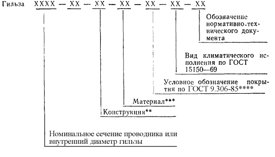 остальных 2.3. Структура условного обозначения кабельных гильз должна соответствовать указанной в приложении 1. Примеры условных обозначений: гильзы закрытой с внутренним диаметром 12 мм, исполнения Т, категория размещения 2: Гильза 12-Т2 ГОСТ 23469.2-79 гильзы закрытой сечением 120 мм2, исполнения УХЛ, категории размещения 3: Гильза 120-УХЛ3 ГОСТ 23469.3-79 гильзы закрытой с внутренним диаметром 14 мм для магистрального кабеля и с внутренним диаметром 10 мм для ответвляемого кабеля, исполнения В, категории размещения 1: Гильза 14-10-B1 ГОСТ 23469.4-83. (Измененная редакция, изм. №2, 3). 3. ТЕХНИЧЕСКИЕ ТРЕБОВАНИЯ3.3. Внутренняя поверхность алюминиевых гильз, закрепляемых опрессовкой, должна быть зачищена от окисной пленки и в течение не более 1 ч после зачистки покрыта кварцевазелиновой пастой. (Измененная редакция, изм. № 3). 3.4. Открытые гильзы должны иметь рифления на внутренней поверхности. Допускается в технически обоснованных случаях по согласованию с потребителем гильзы исполнений 1Н и 1C изготавливать без рифлений на внутренней поверхности. 3.5. Открытые гильзы номинального сечения до 10 мм2 должны изготовляться в виде цепи и направляться на опрессовку в кассетах, если отсутствует дополнительное указание в договоре на поставку. Кассеты для намотки кабельных гильз приведены в рекомендуемом приложении 2. При необходимости на гильзы может быть нанесено защитное металлическое покрытие, вид и толщина которого должны соответствовать требованиям ГОСТ 9.306-85. Покрытие выбирается в соответствии с условиями эксплуатации, указанными в ГОСТ 9.303-84. (Измененная редакция, изм. №2, 3). 3.7. Контактные соединения гильз с жилами проводов и кабелей должны соответствовать, если они не указаны в стандартах или технических условиях на конкретные типы гильз, требованиям ГОСТ 10434-82, предъявляемым к соединениям класса 1 в части: начального электрического сопротивления и сопротивления после ускоренного испытания в режиме циклического нагревания соединений алюминиевых и медных гильз. Начальное сопротивление опрессованных соединений открытых латунных гильз должно быть не более 1,5 значения сопротивления участка соединяемого проводника, длина которого равна длине контактного соединения; наибольшей допустимой температуры контактного соединения и разности температур контактного соединения и проводника; прочности при воздействии статических осевых нагрузок на растяжение. (Измененная редакция, изм. №2). 3.8, 3.9 (Исключено, изм. №2). 3.10. Гильзы должны сохранять свои параметры, установленные настоящим стандартом при транспортировании и хранении в процессе и после воздействия климатических факторов внешней среды. Виды воздействующих климатических факторов внешней среды по ГОСТ 15150-69. Номинальные значения климатических факторов внешней среды по ГОСТ 15150-69 и ГОСТ 15543.1-89. Виды климатических исполнений и категории размещения изделий в соответствии с требованиями ГОСТ 15150-69 и настоящего стандарта должны быть приведены в стандартах пли технических условиях на конкретные типы гильз. (Измененная редакция, изм. №2, 3). 3.11. Срок службы гильз - не менее 25 лет. (Добавлено, изм. №2). 4. ПРАВИЛА ПРИЕМКИ4.1. Для проверки соответствия гильз требованиям настоящего стандарта устанавливаются приемо-сдаточные, периодические и типовые испытания. 4.2. Гильзы предъявляют к испытаниям партиями. За партию прини