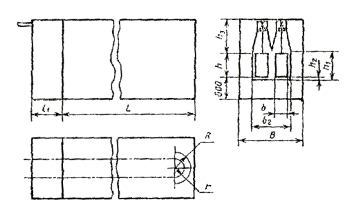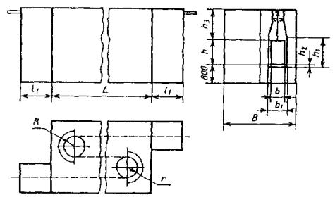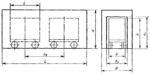Примечание. Размеры обрабатываемого изделия указывают следующим образом: для установок проходных с подвесным толкающим непрерывно движущимся конвейером с одним ходом приводится шифр; для установок проходных с напольным непрерывно движущимся конвейером с одним ходом - ширина и высота изделия в метрах, для остальных установок - длина, длина, ширина и высота в метрах. Пример условного обозначения терморадиационно-конвективной (Т/К) сушильной установки с электрообогревом (Э) проходной (П) с подвесным толкающим (Т) непрерывно движущимся конвейером с тепловым подпором воздуха (В), одноходовой (1), в которой обрабатываются изделия шириной 0,63 м и высотой 1,6 м (05); Сушильная установка Т/К-ЭПТВ-1-05 ГОСТ 23093-78 Пример условного обозначения терморадиационной (Т) сушильной установки с электрообогревом (Э) проходной (П) с напольным (Н) непрерывно движущимся конвейером, однопроходной (1), в которой обрабатываются изделия шириной 0,4 м и высотой 1,0 м; Сушильная установка Т-ЭПН-1-0,4×1,0 ГОСТ 23093-78 Пример условного обозначения конвективной (К) сушильной установки с газовым обогревом (Г) проходной (П) с напольным циклически движущимся конвейером (НЦ), двухходовой (2), в которой обрабатываются изделия длиной 1,5 м, шириной 0,63 м и высотой 1,0 м; Сушильная установка К-ГПНЦ-2-1,5×0,63×1,0 ГОСТ 23093-78 (Измененная редакция, Изм. № 2). 1.4. Выбор типов сушильных установок приведен в рекомендуемом приложении. 2. ОСНОВНЫЕ РАЗМЕРЫ2.1. Основные размеры сушильных установок конвективных проходных с подвесным конвейером одноходовых (черт. 1) должны соответствовать табл. 3. Черт. 1 Таблица 3 мм
