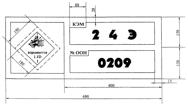 Знаки опасности должны иметь форму квадрата, повернутого на угол, со стороной не менее 100 мм, который условно разделен на два равных треугольника. В верхнем треугольнике каждого знака наносятся символы опасности - черная взрывающаяся бомба для подклассов 1.1, 1.2, 1.3, а для трех следующих подклассов - их номера (1.4, 1.5, 1.6); в нижнем углу нижнего треугольника наносится группа совместимости. Для ВМ первых трех классов, кроме группы совместимости, указывается и номер подкласса. Приложение 3ПЕРЕЧЕНЬ