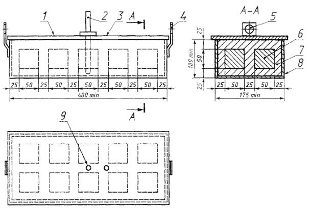 7.2 Подготовка образцов7.2.1 Образцы для контроля изготовляют в соответствии с ГОСТ 2409, ГОСТ 4071.1 и ГОСТ 11573 со следующими дополнениями: - допускается вырезать (высверливать, отсекать) образец перпендикулярно к трем осям изделия; - после применения режущего инструмента с водяным охлаждением образец высушивают до постоянной массы при температуре (110 ± 5) °С в сушильном шкафу с вентиляцией или струей теплого воздуха; - температура образца из смолосвязанного (пекосвязанного) изделия не должна превышать 40 °С; - образец из гидратирующегося изделия для испытаний при комнатной температуре, который можно вырезать только с применением воды, не должен находиться в контакте с водой более 30 мин при условии отсутствия гидратации в течение этого времени; - образец из гидратирующегося изделия, которое предназначено для коксования, не должен контактировать с водой; - образец из безобжигового изделия (кроме пекосвязанного и смолосвязанного) вырезают сухим способом или применяют жидкость, не взаимодействующую с материалом образца. Испытания пекосвязанных и смолосвязанных изделий допускается проводить на образцах-свидетелях. 7.2.2 Процедура коксования образцов 7.2.2.1 Подготовка камеры для коксования Дно камеры для коксования покрывают слоем кокса, на который устанавливают предварительно взвешенные образцы (т1) на одинаковом расстоянии от стенок камеры, при этом толщина слоя кокса между образцами и стенками должна быть не менее 25 мм. При необходимости в промежутках помещают распорки заданного размера и аналогичного с образцами химико-минералогического состава. Затем образцы засыпают слоем кокса толщиной около 25 мм (см. рисунок 1). Камеру закрывают крышкой и устанавливают термопару. Камеру для коксования устанавливают в печь. Нагревают печь с такой скоростью, чтобы температура в камере в течение первого часа поднялась до 120 °С и далее до 990 °С поднималась по 220 °С в час. Длительность изотермической выдержки при температуре (990 ± 10) °С - 3,0 - 3,5 ч. Камеру охлаждают в печи. Образцы извлекают из камеры, очищают от налипшего кокса щеткой или, при необходимости, металлическим скребком и взвешивают с точностью до 0,2 г (m2). 8 Порядок проведения контроля8.1 Определение изменения массы при коксованииИзменение массы при коксовании mкокс, %, вычисляют по формуле