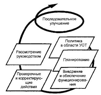 Рисунок - Модель системы управления охраной труда (СУОТ) Известный британский стандарт BS 8800-96 «Руководство по системам управления охраной здоровья и безопасностью персонала» (Guide to Occupational health and safety management systems) и разработанный на его основе OHSAS 18001-99 (аббревиатура OHSAS - Occupational Health and Safety Assessment Series) «Системы управления охраной здоровья и безопасностью персонала. Требования» и руководство Международной организации труда ILO - OSH 2001 ориентированы на создание системы управления охраной труда организации, которая в виде подсистемы могла бы быть объединена с другими подсистемами системы управления (менеджмента) в рамках единой интегрированной системы управления (менеджмента) организации. (Измененная редакция. Изм. № 1). Настоящий государственный стандарт содержит требования к системам управления охраной труда в организации, стандарт гармонизирован со стандартом OHSAS 18001-991) и руководством ILO - OSH 2001. Следует отметить, что создание системы не является обязательным, а определяется лишь намерениями организации совершенствовать свою деятельность в области охраны труда. 1) Стандарт OHSAS 18001-99 разработан при участии национальных органов по стандартизации ряда стран (Великобритания, Япония, ЮАР, Ирландия), фирм и исследовательских организаций (Измененная редакция. Изм. № 1). Система управления охраной труда, соответствующая требованиям настоящего стандарта, предназначена для реализации организацией своей политики и задач в области охраны труда и оценки ее деятельности в этой области сторонними организациями. Стандарт является общетехническим, устанавливающим требования к элементам системы управления охраной труда. Требования стандарта применимы к организациям всех типов и размеров, независимо от конкретного сектора экономики (отрасли промышленности). На разработку и внедрение системы управления охраной труда оказывают определенное влияние область деятельности организации, ее конкретные задачи, выпускаемая продукция и оказываемые услуги, а также используемые технологические процессы, оборудование, средства индивидуальной и коллективной защиты работников и практический опыт деятельности в области охраны труда. Успех функционирования системы управления охраной труда зависит от обязательств, взятых на себя на всех уровнях управления, всеми подразделениями и работниками организации, особенно ее руководством (работодателем). (Измененная редакция. Изм. № 1). Настоящий стандарт содержит требования, которые могут быть использованы для объективной самооценки, самодекларации или сертификации. (Измененная редакция. Изм. № 1). ГОСТ Р 12.0.006-2002 ГОСУДАРСТВЕННЫЙ СТАНДАРТ РОССИЙСКОЙ ФЕДЕРАЦИИ Система стандартов безопасности труда ОБЩИЕ ТРЕБОВАНИЯ К СИСТЕМЕ УПРАВЛЕНИЯ System of standards for labor safety.