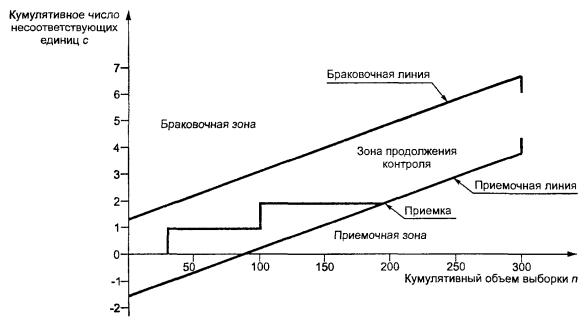 Примечание: Символ # означает, что решение о приемке для этого объема выборки не допускается. Правила многоступенчатого контроля повторяют (в более расширенном виде) правила двухступенчатого контроля. Отличие их состоит в том, что в некоторых случаях символ # заменяет приемочное число. Это означает, что приемка для данного объема выборки не разрешена и остаются только два возможных решения на данном этапе: отклонение или продолжение проверки последующей выборки. Во всех планах многоступенчатого контроля (ГОСТ Р 50779.71) все семь объемов выборок совпадают, что видно из приведенного примера (3.16). 2.22 Последовательный отбор выборки При последовательном контроле случайные единицы продукции извлекают из партии и проверяют одну за другой. Применяют кумулятивный (суммарный) подсчет числа проверенных и обнаруженных несоответствующих единиц. В соответствии с правилами принятия решения партию принимают или отклоняют по мере того, как появляются основания в пользу первого или второго. Во избежание возможности продолжения контроля в течение неопределенного периода времени без достижения решения предусмотрено правило усечения контроля. Контроль прекращают при достижении заранее заданного объема выборки. При этом заранее определяют критерии принятия решений на данном этапе. В ГОСТ Р 50779.75 описаны процедуры построения последовательных планов по альтернативному признаку. Эти планы могут быть выбраны с теми же значениями рисков изготовителя и потребителя, что и планы ГОСТ Р 50779.71. Графически последовательный выборочный контроль может быть представлен следующим примером 11. Пример 11 На рисунке 3 описан план последовательного контроля, соответствующий планам одно- и двухступенчатого контроля, описанным в 2.20, и многоступенчатому плану - в 2.21. В данном случае общее число проверяемых единиц усечено до 300 шт. При этом решение о приемке принимают при пяти или менее несоответствующих единицах, обнаруженных в выборке объема 300. В противном случае партию отклоняют. На участке между приемочной и браковочной линиями несоответствия обнаружены на отметках 30 и 100. Зона приемки достигается по окончании контроля 198-го изделия. Партию оценивают как приемлемую. Рисунок 3 - Работа с выборочным планом усеченного последовательного контроля с AQL = 0,65% и кодом объема выборки L 2.23 Контроль с пропуском партий Если в непрерывной серии партий качество продукции, представляемой на контроль, как правило, лучше AQL и отвечает определенным критериям, можно начинать контроль с пропуском партий. В ГОСТ Р 50779.73 описана процедура такого контроля, в которой систематически оценивают качество продукции для возможности контроля с пропуском партий. Если качество продукции соответствует требованиям, выбирают частоту контроля партий, например 1 из 2, 1 из 3, 1 из 4 или 1 из 5. Меньшая частота допускается только в том случае, если качество продукции заметно лучше AQL. Контроль с частотой 1 из 5 изначально невозможен. Случайным методом выбирают, должна ли данная партия пройти выборочный контроль или принята без контроля. Если качество после выборочного контроля снижается, возвращаются на выборочный контроль каждой партии до того момента, пока оно не будет соответствовать установленным требованиям. Преимущества случайной выборки и вычисляемых рисков сохраняются. Объем контроля с пр