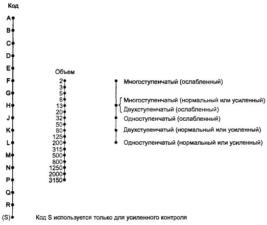 Примечание: AQL = 10% несоответствующих единиц продукции, уровень контроля I (пример 34); А - приемлемая партия, N - неприемлемая партия. В каждой выборке до партии № 81 включительно было обнаружено не более 7 несоответствующих изделий, и ослабленный контроль продолжался, но обнаружение 9 несоответствующих изделий в партии № 82 требует возобновления нормального контроля, даже если партия принята. Усиленный контроль должен быть применен спустя три партии ввиду того, что партии №№ 83 и 85 из последних пяти на нормальном контроле отклонены. Поскольку ослабленный контроль не обязателен, контролер может возобновить нормальный контроль уже с партии № 79, выявив 14 несоответствующих единиц из 96 в выборках из партий №№ 76, 77, 78, откуда следует, что уровень хуже 10%. Если уровень качества изготовителя лучше AQL, можно использовать и другие процедуры контроля, кроме ослабленного. В некоторых случаях рекомендуется проводить контроль с пропуском партий (ГОСТ Р 50779.73). Если качество процесса изготовителя удовлетворительное и уровень качества значительно лучше AQL, применим косвенный контроль. При этом заказчик может заменить свой приемочный выборочный контроль результатами контроля изготовителя. 3.16 Двух- и многоступенчатый контроль Двух- и многоступенчатые планы выборочного контроля выбирают аналогично одноступенчатым планам, но применяют таблицы III и IV главных таблиц вместо таблицы II или соответствующие части расширенных таблиц X. При использовании расширенных таблиц необходимо внимательно выбирать правильные объемы выборки, поскольку там приводят только суммарные объемы. При этом все планы контроля имеют общее свойство, согласно которому все последовательные выборки равны объему для первой выборки. Это правило легко запомнить. Если соответствующий одноступенчатый план контроля имеет приемочное число 0, а объем выборки 2, двухступенчатый план не применим. Если одноступенчатый план контроля имеет приемочное число 0, а объем выборки 2, 3 или 5, то многоступенчатый план не применим. В качестве альтернативы можно использовать одноступенчатый, двух- и многоступенчатый планы контроля для следующих больших объемов выборки, имеющихся для требуемого AQL. Пример 35 При AQL, равном 0,40, и коде G в таблице III-A имеется звездочка. Можно использовать таблицу II-А, тогда получим план, для которого: объем выборки n = 32 единицы; приемочное число Ас = 0 несоответствующих единиц; браковочное число Re = 1 несоответствующая единица или получить в колонке 0,40 таблиц III-A следующий план двухступенчатого контроля с кодом К: выборка Первая выборка Вторая выборка Объединенная Объем выборки 80 80 160 Приемочное число 0 1 - Браковочное число 2 2 - При использовании расширенных таблиц существуют те же альтернативы. Для двух- и многоступенчатого ослабленного контроля результат, попадающий между приемочным и браковочным числами по любой выборке, кроме последней, означает, что последующая выборка необходима как при нормальном, так и при усиленном контроле. Но теперь существует также разрыв между последними приемочным и браковочным числами. Попадание результата в этот разрыв означает, что партия должна быть принята, а нормальный контроль возобновлен, как и при ослабленном одноступенчатом контроле. В таблице IX приведены кривые «средних объемов выборки» для двухступенчатого и многоступенчат