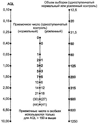 Наиболее типичен подход, при котором объемы выборок для каждого класса несоответствий одинаковы при различных приемочных числах, что облегчает организацию контроля, так как одна и та же один раз извлеченная выборка может быть использована для каждого класса (при условии, что контроль неразрушающий для более чем одного вида несоответствия). Выборка из 125 изделий конкретной партии дала следующие результаты по параметрам: 1 - одно несоответствующее изделие; 2 и 4 - одно несоответствующее изделие; 3 - два несоответствующих изделия; 3 и 4 - три несоответствующих изделия. В партии обнаружено два несоответствующих изделия по несоответствиям класса А и пять изделий для класса В. При таких результатах контроля партия будет принята. Пример 17 Продукция должна быть проконтролирована в следующих условиях: объем партии 500, уровень контроля II, контроль нормальный одноступенчатый выборочный. Значения AQL следующие: