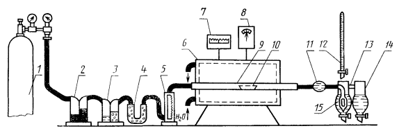 Срок действия c 01.01.88 до 01.01.98 Несоблюдение стандарта преследуется по закону Настоящий стандарт устанавливает титриметрический, кулонометрический методы и метод инфракрасной спектроскопии определения серы в углеродистой стали и нелегированном чугуне при массовой доле от 0,002 до 0,40 %. (Измененная редакция, Изм. № 1). 1. ОБЩИЕ ТРЕБОВАНИЯ1.1. Общие требования к методам анализа - по ГОСТ 22536.0-87. 2. ТИТРИМЕТРИЧЕСКИЙ МЕТОД2.1. Сущность метода Метод основан на сжигании навески пробы в токе кислорода при температуре 1250 - 1350 °С, поглощении двуокиси серы водой и титровании образующейся сернистой кислоты раствором смеси йодноватокислого и йодистого калия или раствором йода в присутствии индикатора крахмала. Установка для титриметрического определения серы (черт. 1), состоящая из баллона с кислородом или кислородопровода 1, снабженного редукционным вентилем и манометром для пуска и регулирования тока кислорода; промывной склянки 2, содержащей раствор марганцовокислого калия с массовой концентрацией 40 г/дм3 в растворе гидрооксида калия с массовой концентрацией 400 г/дм3; склянки Тищенко с концентрированной серной кислотой 3, V-образной трубки 4, заполненной безводным хлористым кальцием или ангидроном (допускается проводить сухую очистку кислорода; для этого вместо склянок 2, 3, 4 используют хлоркальциевую трубку, колонку с аскаритом и V-образную трубку, содержащую в первой половине (по ходу газа) асбест, пропитанный двуоксидом марганца, во второй - ангидрон); ротаметра для измерения расхода кислорода 5; трубчатой горизонтальной печи с силитовыми нагревателями, обеспечивающими нагрев 1250-1350 °С 6; терморегулятора 7, с помощью которого поддерживают постоянной температуру печи; регулятора напряжений 8 (допускается применять другие типы трубчатых печей, обеспечивающих необходимую температуру); огнеупорной муллитокремнеземистой трубки 9 по нормативно-технической документации, предназначенной для сжигания навески, длиной 600-800 мм, с внутренним диаметром 20-22 мм. Концы трубки должны выступать из печи не менее чем на 200 мм с каждой стороны (трубку закрывают металлическими затворами или хорошо подогнанными резиновыми пробками с отверстиями и с металлическими наконечниками, предотвращающими обгорание пробок. В отверстия пробок вставляют стеклянные или латунные соединительные трубки. Перед употреблением фарфоровую трубку прокаливают по всей длине в печи при рабочей температуре); лодочки фарфоровой по ГОСТ 9147-80 10, предназначенной для сжигания навески, выдерживающей температуру 1350 °С (перед применением лодочку прокаливают в токе кислорода при рабочей температуре и хранят ее в эксикаторе, шлиф крышки которого не должен покрываться смазывающими веществами); фильтра 11 для поглощения твердых оксидов, образующихся при сжигании навески и уносимых током кислорода из печи (фильтр представляет собой стеклянный шарообразный или цилиндрический сосуд, заполненный стеклянной или хлопчатобумажной ватой); микробюретки 12 или бюретки вместимостью 25 см3, содержащей раствор йодид-йодата калия или раствор йода; поглотительного сосуда 13 высотой 250-265 мм и диаметром 30-35 мм; сосуда для раствора сравнения 14 высотой 250-265 мм и диаметром 30-35 мм. Схема ячейки, состоящей из поглотительного сосуда и сосуда сравнения, приведена на черт. 2. В поглотительный сосуд впаяна Г-образная с