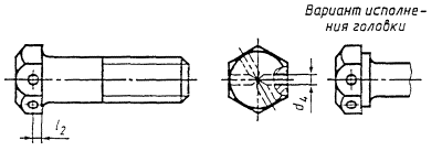 болты исполнений 1 и 2 с лункой на торцевой поверхности головки с размерами, не