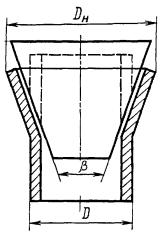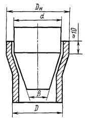 Черт. 1 Черт. 2 3.2. Рабочая поверхность оправки должна иметь твердость HRC³50, параметры шероховатости поверхности не ниже Rz=20 мкм по ГОСТ 2789-73 и при испытании должна быть покрыта консистентной смазкой. 3.3. При испытании не допускается вращательное движение оправки или образца. Скорость внедрения оправки в образец при разногласиях в оценке качества испытания должна быть 20-50 мм/мин. 3.4. Испытание проводят плавной раздачей конца образца оправкой с заданным углом конусности до получения у торца образца заданного наружного диаметра DH (черт. 2). 4. ОБРАБОТКА РЕЗУЛЬТАТОВ4.1. Признаком того, что образец выдержал испытание, служит отсутствие на нем после раздачи на заданную величину трещин или надрывов с металлическим блеском, определяемых визуально. 4.2. Величину раздачи (X) в процентах вычисляют по формуле