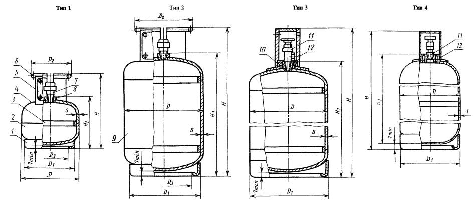 Дата введения 01.07.85 Настоящий стандарт распространяется на стальные сварные баллоны с запорными устройствами (далее - баллоны) объемом 5, 12, 27 и 50 л на давление до 1,6 МПа, предназначенные для транспортирования и хранения сжиженных углеводородных газов (пропана, бутана и их смесей). Требования настоящего стандарта являются обязательными. Стандарт соответствует рекомендации по стандартизации - PC 2978 в части баллонов объемом 12, 27 и 50 л. (Измененная редакция, Изм. № 1, 2). 1. ТИПЫ, ОСНОВНЫЕ ПАРАМЕТРЫ И РАЗМЕРЫ1.1. Баллоны должны изготавливаться следующих типов: 1 - баллоны без обечайки с клапаном; 2 - баллоны с обечайкой и клапаном; 3 - баллоны с обечайкой и вентилем; 4 - баллоны без обечайки с вентилем; и исполнений: с воротником - В; с колпаком - К; с ручкой (ручками) - Р. (Измененная редакция, Изм. № 2). 1.2. Основные параметры и размеры баллонов должны соответствовать указанным на черт. 1 и в табл. 1. 1 - башмак; 2 - днище нижнее; 3 - кольцо подкладное; 4 - днище верхнее; 5 - табличка; 6 - воротник; 7 - клапан; 8 - горловина; 9 - обечайка; 10 - кольцо горловины; 11 - вентиль; 12 - колпак Черт. 1 Примечания: 1. Чертеж не определяет конструкции баллона. 2. Допускается изготовлять баллоны без подкладных колец путем соединения с внутренней обжимкой одной из деталей. Таблица 1 Размеры, мм