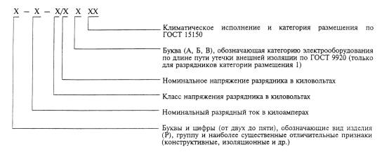 Пример условного обозначения разрядника вентильного серийного группы III на номинальный разрядный ток 5 кА, класс напряжения 110 кВ, номинальное напряжение разрядника 102 кВ, категории по длине пути утечки на 20 % выше А, климатического исполнения У, категории размещения 1: РВС III-5-110/102 АУ1 Примечания: 1. Буквенная часть условного обозначения - обозначение серий; римская цифра - группа; совокупность буквенного и цифрового обозначения, значения номинального грозового разрядного тока, значений класса напряжения разрядника, номинального напряжения разрядника и категории по длине пути утечки - обозначение типа; приведенное выше обозначение в целом - обозначение типоисполнения разрядника. 2. Структура указанного обозначения по п. 2.3 распространяется на разрядники, технические задания на которые утверждены после 1 января 1986 г. 3. ТЕХНИЧЕСКИЕ ТРЕБОВАНИЯ3.1. Общие требования 3.1.1. Разрядники должны изготовляться в соответствии с требованиями настоящего стандарта, технических условий на конкретный разрядник и по рабочим чертежам, утвержденным в установленном порядке. 3.1.2. Разрядники должны изготовляться на номинальные напряжения: до 75 (110Н)* кВ включительно для сетей с изолированной и заземленной нейтралью; 102 (110) кВ для сетей с заземленной нейтралью (коэффициент замыкания на землю не более 1,4); 126 (110) кВ для сетей с изолированной нейтралью (коэффициент замыкания на землю не более 1,73); от 138 (150) до 600 (750) кВ для сетей с заземленной нейтралью (коэффициент замыкания на землю не более 1,4). _____________ * Далее по тексты стандарта после значения номинального напряжения в скобках указан класс напряжения разрядника. 3.1.3. Разрядники должны быть предназначены для эксплуатации в районах с умеренным и (или) холодным климатом в условиях, предусмотренных для климатических исполнений У и (или) ХЛ категорий размещения 1, 2, 3, 4, 5 по ГОСТ 15150, и удовлетворять в части воздействия климатических факторов внешней среды требованиям ГОСТ 15150 и ГОСТ 15543.1, а также должны работать в условиях умеренно и интенсивно загрязненной атмосферы по ГОСТ 9920. 3.1.4. Разрядники должны быть предназначены для эксплуатации на высоте не более 1000 м над уровнем моря. Для разрядников, предназначенных для эксплуатации на высоте от 1000 до 2000 м над уровнем моря, отдельные характеристики устанавливаются по согласованию потребителя (заказчика) с изготовителем. (Измененная редакция, Изм. № 1). 3.1.5. Основные электрические характеристики разрядников должны соответствовать указанным в табл. 2 - 4. Основные электрические характеристики разрядников
