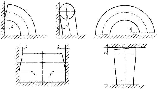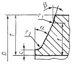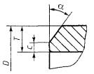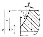 5.1.3.1 По согласованию между изготовителем и потребителем (заказчиком) допускается для деталей исполнения 2 контролировать D и D1 вместо d и d1 соответственно. При этом предельные отклонения должны быть не более: ± 0,5 мм при D или D1 до 57 мм; ± 1,0 % » » » » св. 57 до 219 мм; ± 1,25 % » » » » 219 мм. 5.1.3.2 Предельные отклонения наружного диаметра отводов исполнения 2 в неторцевых сечениях не должны быть более ± 3,5 %. 5.1.3.3 Относительная овальность отводов исполнения 2 - не более 6 %. 5.1.3.4 Угол между плоскостью торца и образующими прилегающих к торцу поверхностей (исключая скос кромок под сварку) деталей исполнения 2 (например при переходе от Тв к Т и T1) должен быть не менее 60° по наружной поверхности и 70° - по внутренней поверхности. 5.1.3.5 На отводах исполнения 2 допускается волнистость (гофры) (рисунок 2) высотой h1, вычисленной по формуле (1), но не более 0,03 D. При этом размер l должен быть не менее 15 h1. Рисунок 2 5.1.3.6 На цилиндрической части магистрали тройников исполнения 2, изготовленных гидроштамповкой, допускается волнистость (гофры) по п. 5.1.3.5. Высота волн h1 должна быть, мм, не более: 1,0 - при D = 57 мм; 1,5 - при D от 76 до 133 мм включ.; 2,0 - при D от 159 до 219 мм включ.; 3,0 - при D = 273 мм; 4,0 - при D от 325 до 426 мм включ. Размер l при этом должен быть не менее 3 h1. (Введен дополнительно. Изм. № 1) 5.1.4 Форма кромок торцов деталей исполнения 1 должна соответствовать указанной в таблице 6. Таблица 6 - Форма кромок деталей исполнения 1 Размеры в миллиметрах