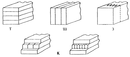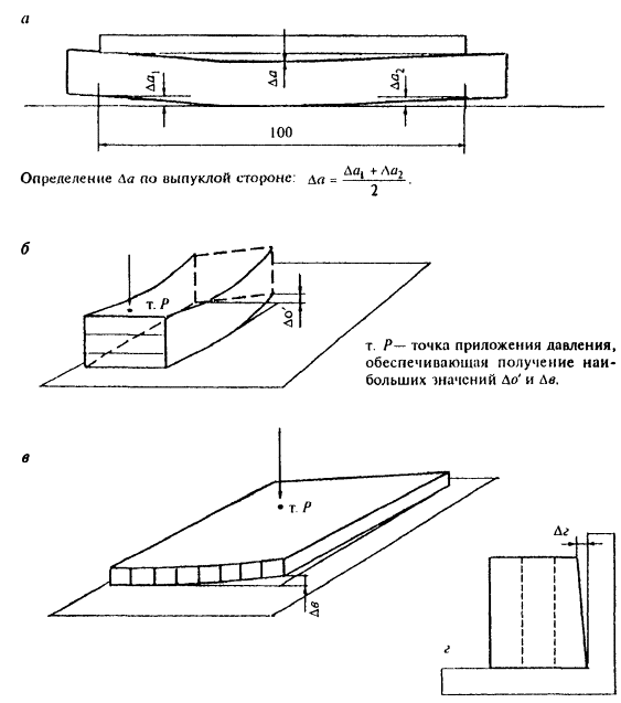 4.2.2 При изготовлении брусковых и щитовых заготовок с длиной, кратной номинальному размеру, допуски по длине устанавливают в договоре на поставку. 4.2.3 Предельные отклонения формы заготовок и деталей (рисунок 10) не должны быть более: от прямолинейности брусковых заготовок - 1,5 мм на 1 м длины (рисунок 10, а); от прямолинейности брусковых заготовок, калиброванных по сечению, и брусковых деталей - 1,0 мм на 1 м длины (рисунок 10, б); от плоскостности брусковых заготовок - 2,0 мм на 1 м длины (рисунок 10, б); от плоскостности брусковых деталей - 1,0 мм на 1 м длины (рисунок 10, б); от плоскостности щитовых заготовок - 2,0 мм на 1 м длины и ширины (рисунок 10, в); от перпендикулярности смежных сторон по сечению деталей и калиброванных заготовок - 0,3 мм на 0,1 м (рисунок 10, г); or перпендикулярности смежных сторон щитовых заготовок - 0,5 мм на 0,1 м. 4.3 Характеристики4.3.1 В зависимости от принятой схемы склеивания заготовки и детали могут быть склеены по длине, ширине и толщине (рисунок 1). Склеивание древесины по длине должно выполняться на зубчатый шип длиной не более 11 мм с учетом требований ГОСТ 19414, длину заготовок для сращивания реек внутренних слоев не ограничивают. Длину заготовок для сращивания реек наружных слоев устанавливают в договоре на поставку, но не менее 180 мм. При склеивании брусковых заготовок и деталей по ширине (толщине) рекомендуется выклеивать брус из двух, трех и более реек радиального распила, которые могут быть сращены на зубчатый шип. При склеивании щитовых заготовок применяют рейки радиального или тангенциального распила. В случае склеивания реек тангенциального распила ширина рейки не должна превышать его толщину более чем в два раза (кроме варианта склеивания дверных филенок, предназначенных под прозрачное покрытие). Требования к используемым для склеивания рейкам (угол наклона годичных слоев, расстояние между годичными слоями и др.) устанавливают в конструкторской документации, а также в договоре на поставку. При использовании для изготовления оконных блоков древесины хвойных пород с расстоянием между годичными слоями для сосны, ели и пихты - не более 1,5 мм, для лиственницы - не более 2,0 мм к обозначению группы качества добавляют букву «К» (конструкционная), например, «1-К» (расстояние между годичными слоями определяют согласно НД или условиям договора на поставку). 4.3.2 Клеевое соединение должно быть прочным и плотным. Зазоры в клеевых соединениях не допускаются. 4.3.3 Прочность клеевых соединений должна быть не менее: на скалывание древесины вдоль волокон при склеивании по толщине и ширине ….….. 4,0 МПа; на изгиб при склеивании по длине на зубчатый шип …………………….……………… 26,0 МПа. 4.3.4 Клеевые соединения заготовок и деталей, предназначенных для эксплуатации в наружных условиях, должны быть водостойкими (не ниже группы «средняя Б» по ГОСТ 17005). Клеевые соединения заготовок и деталей, предназначенных для эксплуатации во внутренних условиях, должны отвечать требованиям, предъявляемым к группе «средняя А» по ГОСТ 17005. 4.3.5 Долговечность (стойкость к эксплуатационным воздействиям) клеевых соединений брусковых заготовок и деталей оконных и дверных блоков устанавливают в нормативной документации на конкретные типы этих изделий. 4.4 Требования к древесине4.4.1 Для изготовления заготовок и деталей применяют древесину хвойных пород не ниже второго со