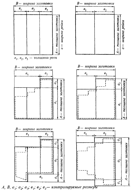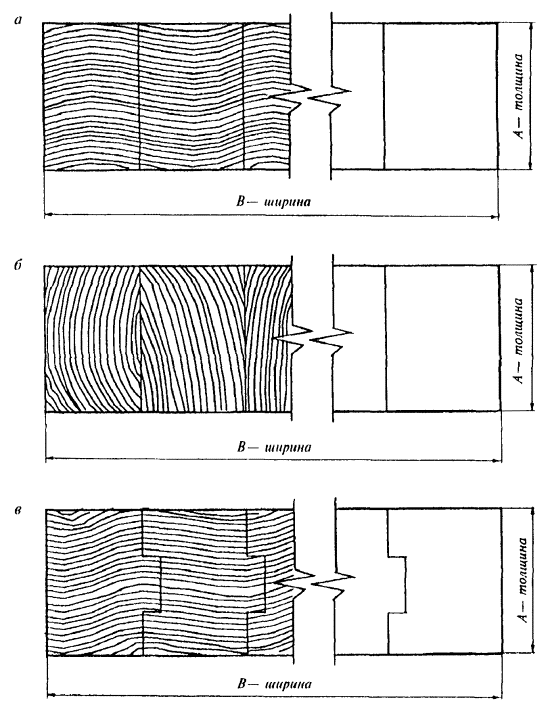 Рисунок 5 - Примеры сечений брусковых деталей для оконных и балконных дверных блоков по ГОСТ 24700 а, б - щитовые заготовки, склеенные на гладкую фугу; в - щитовая заготовка, склеенная на прямой шпунт-гребень Рисунок 6 - Примеры поперечных сечений щитовых заготовок и расположения годичных слоев 4.2 Требования к предельным отклонениям размеров и формы4.2.1 Предельные отклонения номинальных размеров заготовок и деталей по толщине (высоте) и ширине не должны превышать значений, установленных в таблице 1. Таблица 1
