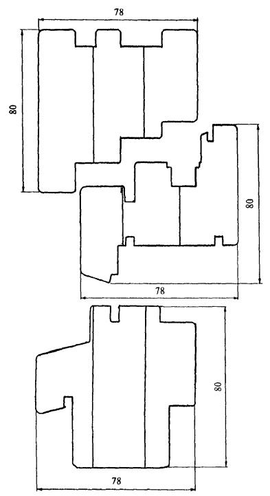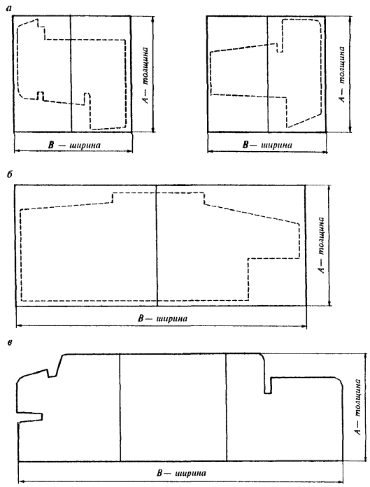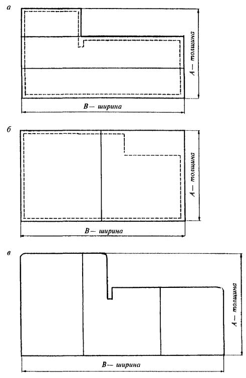 Рисунок 4 - Примеры сечений брусковых заготовок (а, б) и детали (в) для дверных блоков по ГОСТ 6629, склеенных по толщине (а) и ширине (б и в)