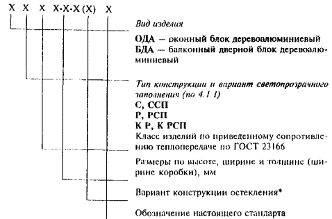 * Рекомендуемая составляющая условного обозначения. Примеры условного обозначения: ОДАК РСП Б2 1760-1650-130 4М1+(4М1-16Ar-К4) ГОСТ 25097-2002 - оконный блок деревоалюминиевый раздельной конструкции с алюминиевыми наружной створкой и коробкой и деревянными внутренней створкой и коробкой, со стеклом и стеклопакетом, класса Б2 по показателю приведенного сопротивления теплопередаче, высотой 1760 мм, шириной 1650 мм, толщиной (шириной коробки) 130 мм, с конструкцией остекления: наружное стекло толщиной 4 мм марки M1 по ГОСТ 111, стеклопакет: наружное стекло толщиной 4 мм марки M1 по ГОСТ 111; межстекольное расстояние 16 мм с заполнением аргоном, внутреннее стекло толщиной 4 мм с твердым теплоотражающим покрытием по ГОСТ 30733. БДА С Д2 2175-720-32 ГОСТ 25097-2002 - балконный дверной блок деревоалюминиевый спаренной конструкции с алюминиевой наружной створкой и деревянными внутренней створкой и коробкой, класса Д2 по показателю приведенного сопротивления теплопередаче, высотой 2175 мм, шириной 720 мм и толщиной (шириной) коробки 82 мм. При оформлении договора (заказа) на изготовление (поставку) рекомендуется указывать вариант конструктивного решения изделия, чертеж с указанием схемы открывания, типы оконных приборов, вид отделки и требования к внешнему виду, группы качества клееных заготовок и другие требования по согласованию изготовителя с заказчиком. 5 Технические требования5.1 Общие положения5.1.1 Изделия должны соответствовать требованиям настоящего стандарта, ГОСТ 23166 и изготавливаться по конструкторской и технологической документации, утвержденной в установленном порядке. 5.1.2 Архитектурные рисунки изделий, а также их габаритные размеры устанавливают в проектной документации и (или) в договоре на изготовление изделий. 5.1.3 В конструкциях оконных блоков следует предусматривать распашное открывание створчатых элементов. Допускается при использовании специальных оконных приборов изготавливать конструкции изделий с откидным и поворотно-откидным открыванием створок. Оконные блоки для жилых помещений и кухонь должны иметь форточки, вентиляционные клапаны, клапанные створки или узкие створки с регулируемым откидным (поворотно-откидным) открыванием. В оконных блоках спаренной конструкции наружные створки навешивают на внутренние с применением различных типов петель. Наружные и внутренние створки дополнительно скрепляют между собой посредством фиксированных соединительных элементов (винты, защелки, стяжки, завертки). Запорные приборы и ручки устанавливают на внутренних створках. В оконных блоках раздельной конструкции запорные приборы и ручки устанавливают на наружных и внутренних створках. Допускается применение съемных ручек, а также соединение внутренних и наружных створок посредством подвижных фиксаторов открывания (при этом ручки и запорные приборы устанавливают только на внутренних створках). 5.1.4 Номинальные размеры рамочных элементов, сечений брусков, профилей, расположения оконных приборов, петель и функциональных отверстий устанавливают в рабочих чертежах на изготовление изделий. Размеры открывающихся створок и дверных полотен, как правило, не должны быть более: - створки - по ширине 1200 мм, по высоте 1800 мм; - дверные полотна - по ширине 900 мм, по высоте 2300 мм. Масса открывающихся элементов изделий раздельной конструкции не должна превышать 60 кг, сп