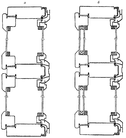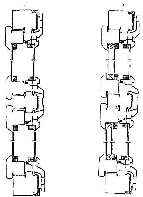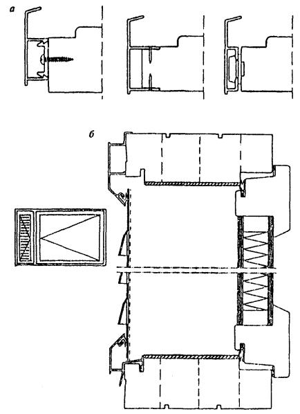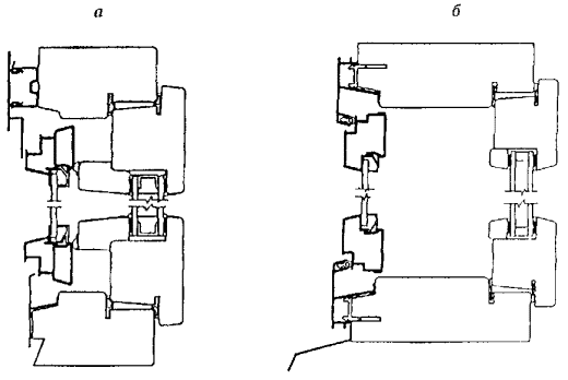 Рисунок 3 - Примеры конструктивных решений оконных блоков спаренной (а) и раздельной (б) конструкции с листовым стеклом и стеклопакетом