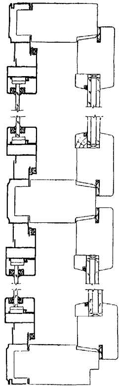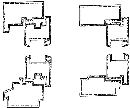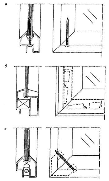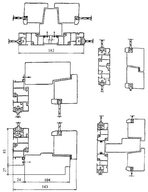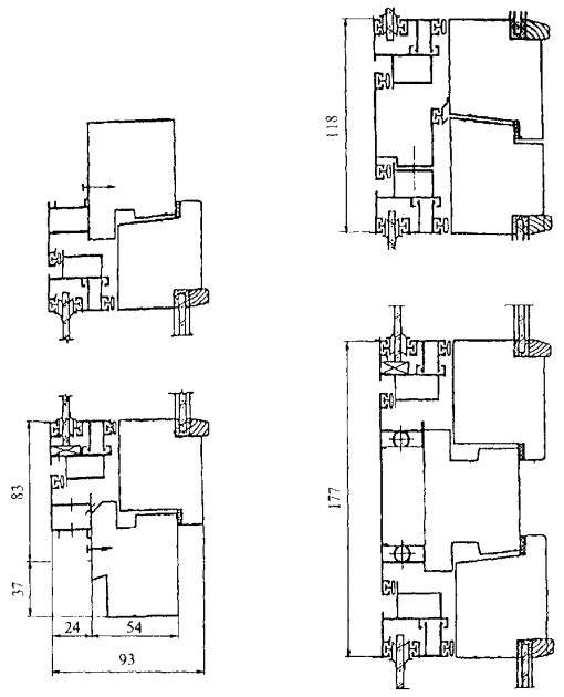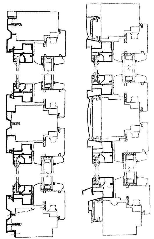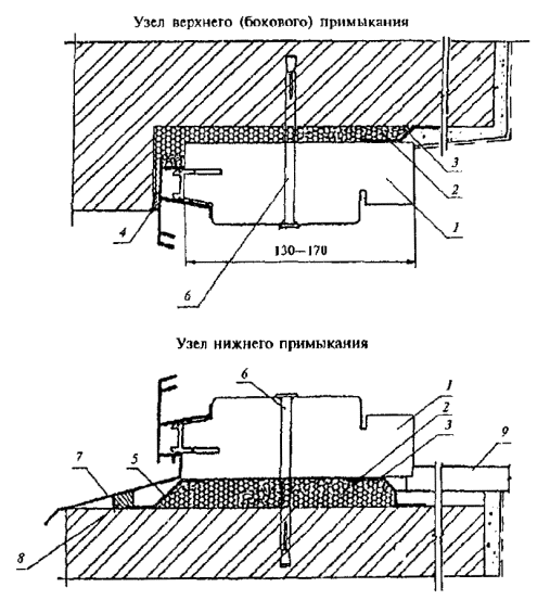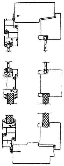Рисунок 7 - Примеры конструктивных решений узлов оконных блоков раздельной конструкции с алюминиевыми наружной створкой и коробкой и деревянными внутренними створкой и коробкой Рисунок 8 - Примеры конструктивных решений оконных блоков спаренной конструкции с алюминиевыми наружной створкой и коробкой и деревянными внутренними створкой и коробкой 5.1.10 Деревянные и алюминиевые элементы оконных блоков должны иметь атмосферостойкое лакокрасочное или защитно-декоративное покрытие (в зоне контакта с алюминиевыми профилями и монтажными швами поверхности деревянных элементов могут быть антисептированы или иметь защитное покрытие). Алюминиевые элементы оконных блоков должны иметь защитно-декоративное анодно-окисное или лакокрасочное (в том числе порошковое полимерное) покрытие. 5.1.11 Форма и размеры сечений алюминиевых профилей, примыкающих к деревянным поверхностям изделий, должны обеспечивать минимальную площадь соприкосновения с этими поверхностями, а также возможность проветривания полости между ними. Конструкция крепления алюминиевых профилей к деревянным брускам должна обеспечивать возможность компенсации изменения их линейных размеров и деформаций от воздействия эксплуатационных температур. Крепление облицовочных профилей из алюминиевых сплавов к брускам деревянной коробки рекомендуется производить на поворотных втулках, клипсах или другими видами соединений через прокладки из полимерных материалов по НД. Примеры крепления приведены на рисунке А.5 приложения А. 5.1.12 Материалы, применяемые для изготовления изделий, должны быть совместимы. Взаимное влияние материалов не должно снижать эксплуатационные характеристики изделия (например, вызывать электрохимическую коррозию металлов). 5.1.13 Изделия должны быть безопасными в эксплуатации и обслуживании. Условия безопасности применения изделий различных конструкций устанавливают в проектной документации на строительство. В необходимых случаях в изделиях следует предусматривать специальные конструктивные решения для обеспечения требований безопасности (например, применение безопасного закаленного или многослойного стекла). 5.1.14 Изделия должны выдерживать эксплуатационные нагрузки, включая ветровую нагрузку по действующим строительным нормам. 5.1.15 Полимерные материалы и детали изделий должны иметь санитарно-эпидемиологические заключения, оформленные в установленном порядке. 5.1.16 Монтаж оконных блоков следует производить в соответствии с требованиями действующей нормативной документации. Рекомендации по монтажу приведены в приложении Б. 5.2 Требования к предельным отклонениям размеров и формы5.2.1 Рамочные элементы оконных блоков и их детали должны иметь правильную геометрическую форму. Предельные отклонения номинальных размеров сопрягаемых элементов изделий, зазоров в притворах и под наплавом, размеров расположения оконных приборов и петель не должны превышать значений, установленных в таблице 1. Предельные