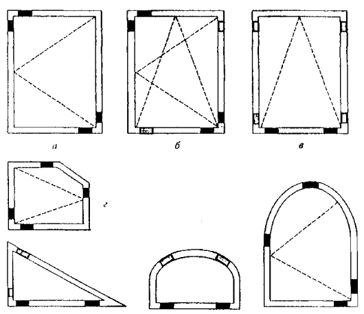 Виды открывания оконных блоков: а - поворотное (распашное); б - поворотно-откидное; в - откидное; г - установка подкладок в фигурных оконных блоках Рисунок 10 - Схемы расположения подкладок при монтаже стеклопакетов (стекол) 5.6.7 Материалы заполнения полотен балконных дверных блоков должны быть устойчивы к атмосферным воздействиям (например, водостойкая фанера по НД с атмосферостойким лакокрасочным покрытием). 5.6.8 Конструктивные решения узлов крепления стеклопакетов, а также панелей заполнения непрозрачной части дверного полотна должны исключать возможность их демонтажа с наружной стороны. 5.6.9 Уплотняющие прокладки должны изготавливаться из атмосфероморозостойких эластичных полимерных материалов по ГОСТ 30778 или другой нормативной документации. Прокладки должны быть установлены по периметру створок без разрывов (кроме специальных конструктивных решений, предусмотренных в конструкторской документации). Прилегание прокладок должно быть плотным, препятствующим проникновению воды. 5.6.10 При установке стекла (стеклопакета) на герметик герметик наносят ровным слоем, без разрывов. Отслоение герметика от стекла и профиля не допускается. 5.6.11 Стеклопакеты и уплотняющие прокладки должны быть испытаны на долговечность в испытательных центрах, аккредитованных на право проведения таких испытаний. Долговечность стеклопакетов должна быть не менее 20 условных лет эксплуатации, а уплотняющих прокладок - 10 лет. Режим испытания стеклопакета на долговечность назначают с учетом его расположения за наружной створкой. 5.6.12 Оконные приборы, петли и крепежные детали должны отвечать требованиям ГОСТ 538, ГОСТ 30777 и НД на конкретные виды этих изделий. Тип, число, расположение и способ крепления запирающих приборов и петель устанавливают в конструкторской документации, исходя из размера и веса открывающихся элементов изделия, а также условий эксплуатации оконных блоков. При этом расстояние между петлями и точками запирания рекомендуется принимать не более 800 мм. Поворотные втулки и клипсы для крепления алюминиевых профилей к древесине рекомендуется изготавливать из конструкционного полиамида или сплавов ЦАМ по НД. 5.6.13 Рекомендуется применение петель и оконных приборов, регулируемых в двух или трех плоскостях. Детали приборов должны иметь анодно-окисное или лакокрасочное защитно-декоративное покрытие по ГОСТ 9.301, ГОСТ 9.031. Покрытия должны быть стойкими к воздействию климатических факторов. 5.6.14 Оконные приборы должны иметь следующие прочностные характеристики: - сопротивление статической нагрузке, действующей на запорные приборы и петли, - не менее 500 Н; - сопротивление крутящему моменту сил, приложенных к ручке в сторону закрывания (ручка в положении «закрыто»), - не менее 25 Н · м; - сопротивление нагрузке, приложенной к ограничителю угла открывания в режиме проветривания, - не менее 500 Н; - сопротивление статической нагрузке, приложенной к ручке перпендикулярно плоскости створки, - не менее 500 Н. 5.6.15 Оконные приборы должны удовлетворять следующим эргономическим требованиям: - усилие, прикладываемое к ручкам створок (полотен) для их открывания, не должно превышать 50 Н (75 Н); - в случае применения поворотно-откидных устройств усилие, необходимое для открывания, закрывания и откидывания створки, прикладываемое к ручке, не должно превышать 100 Н; - м