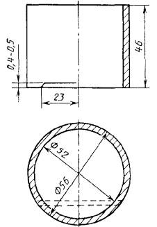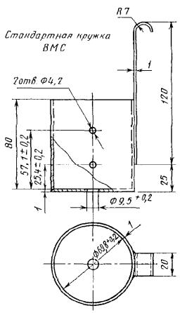где m - масса пары чашек с сухим остатком, г; т2 - масса пары чашек с навеской дисперсии до сушки, г; т1 - масса пары чашек, г. За результат анализа принимают среднее арифметическое результатов двух параллельных определений, абсолютное расхождение между которыми не превышает допускаемое расхождение, равное 0,3 %, при доверительной вероятности Р = 0,95. (Измененная редакция, Изм. № 4). 5.5.2, 5.5.3. (Исключены, Изм. № 4). 5.6. Определение условной вязкости Кружка стандартная ВМС, представляющая собой цилиндрический сосуд, изготовленный из латуни или нержавеющей стали (черт. 2). Секундомер по ГОСТ 5072-79. Термометр с ценой деления не более 2 °С по ГОСТ 27544-87. (Измененная редакция, Изм. № 4). 5.6.2. Проведение испытания 5.6.2.1. Условную вязкость по стандартной кружке ВМС определяют при (20±2) °С. Дисперсию тщательно размешивают, наливают полную кружку, приподнимают ее и наблюдают за уровнем дисперсии. Когда уровень дисперсии в кружке понизится и откроется верхнее боковое отверстие, включают секундомер. Секундомер останавливают в тот момент, когда уровень дисперсии достигает нижнего бокового отверстия. За показатель вязкости принимают время истечения дисперсии от верхнего до нижнего отверстия кружки, выраженное в секундах. За результат анализа принимают среднее арифметическое результатов трех параллельных определений, относительное расхождение между которыми не превышает допускаемое расхождение, равное 10 % среднего результата, при доверительной вероятности Р = 0,95. (Измененная редакция, Изм. № 4). Неуказанные