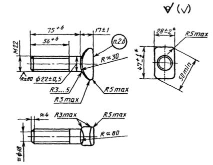 d » dср, где dcp - средний диаметр резьбы. * Размеры указаны с учетом высоты швов от разъема матриц и заусенцев от обсечки облоя. Пример условного обозначения клеммного болта класса точности В, исполнения 1, диаметром резьбы d = 22 мм, с крупным шагом резьбы, с полем допуска 8g, длиной 75 мм, класса прочности 3.6, из спокойной стали, с цинковым покрытием толщиной 9 мкм, хроматированным: Болт M22 - 8g ´ 75.36.C.019 ГОСТ 16016-79 То же, класса точности С, исполнения 2, из автоматной стали без цинкового покрытия: Болт С2 M22 - 8g ´ 75.36.A ГОСТ 16016-79 (Измененная редакция, Изм. № 2). 1.4. Допускается по согласованию с потребителем изготовлять болты с углублением в торце головки, глубиной не более 0,3 высоты головки. (Введен дополнительно, Изм. № 2). 2. ТЕХНИЧЕСКИЕ ТРЕБОВАНИЯ2.1. Клеммные болты должны изготовляться в соответствии с требованиями настоящего стандарта и ГОСТ 1759.0-87 по рабочим чертежам, утвержденным в установленном порядке. 2.2. Механические свойства болтов должны соответствовать классу прочности 3.6, 4.8 или 5.8 по ГОСТ 1759.4-87. 2.1, 2.2. (Измененная редакция, Изм. № 2). 2.3. Клеммные болты должны изготовляться без покрытия. По согласованию потребителя с изготовителем клеммные болты могут иметь цинковое с хроматированием покрытие толщиной 9 - 15 мкм. Требования к покрытию - по ГОСТ 9.301-86. 2.4. Резьба - по ГОСТ 24705-81. После допуска 8 g по ГОСТ 16093-81. 2.5. Смещение оси головки относительно оси стержня болта не должно быть более 0,9 мм. 2.6. Маркировать: товарный знак или условное обозначение предприятия-изготовителя и год изготовления (две последние цифры). Высота знаков маркировки - не менее 8 мм, толщина - не менее 1 мм, выпуклость - не менее 0,5 мм. 2.7. Теоретическая масса 1000 болтов (в скобках - масса болтов с облегченной головкой): 345 (320) - исполнения 1; 335 (310) - исполнения 2. Примечания: 1. Когда возможно применение болтов как в исполнении 1, так и в исполнении 2, в конструкторской документации должна указываться масса в исполнении 1. 2. Изменение массы 1000 болтов при изменении их длины на 10 мм не должно быть более: 29,8 кг - для исполнения 1; 25,7 кг - для исполнения 2. (Измененная редакция, Изм. № 2). 2.8. Правила приемки - по ГОСТ 17769-83. (Измененная редакция, Изм. № 1). 2.9. Методы контроля болтов - по ГОСТ 1759.0-87. Испытания механических свойств болтов должны проводиться по требованию потребителя в соответствии с ГОСТ 1759.4-87. Измерение твердости и испытание на разрыв на косой шайбе не проводится. Допуски размеров, формы и расположение поверхностей и методы их контроля - по ГОСТ 1759.1-82. Дефекты поверхности и методы контроля - по ГОСТ 1759.2-82. (Измененная редакция, Изм. № 1, 2). 2.10. Контроль качества цинкового покрытия - по ГОСТ 9.302-88. 2.11. (Исключен, Изм. № 1). 2.12. Упаковка болтов и маркировка тары - по ГОСТ 18160-72. 2.13. Болты должны быть укомплектованы гайками по ГОСТ 16018-79. Допускается транспортирование болтов и гаек без упаковки, при этом должна быть исключена возможность их смешивания. 2.14. Транспортирование болтов без упаковки на железнодорожных платформах не допускается. СОДЕРЖАНИЕ