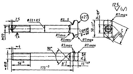 * Размеры указаны с учетом высоты швов от разъема матриц, наплывов металла в углах подголовка и заусенцев от обсечки облоя. Пример условного обозначения закладного болта класса точности В, исполнения 1, диаметром резьбы d = 22 мм, с крупным шагом резьбы, с полем допуска 8g, длиной 175 мм, класса прочности 3.6, из спокойной стали, с цинковым покрытием толщиной 15 мкм, хроматированным: Болт M22 - 8g ´ 175.36.C.0115 ГОСТ 16017-79 То же, класса точности С, исполнения 2, из автоматной стали без цинкового покрытия: Болт С2 M22 - 8g ´ 175.36.A ГОСТ 16017-79. (Измененная редакция, Изм. № 2, 3). 1.2. Допускается изготовление болтов длиной от 145 до 225 мм и длиной резьбы в пределах от 40 до 84 мм по согласованию потребителя с изготовителем. При этом длина болта должна назначаться кратной 10 мм, а длина резьбы кратной: 4 мм - при длине резьбы до 60 мм включ.; 6 мм » » » св. 60 мм. 1.3. Вариант изготовления головки и профиль указательной канавки устанавливает предприятие-изготовитель. (Измененная редакция, Изм. № 3). 2. ТЕХНИЧЕСКИЕ ТРЕБОВАНИЯ2.1. Закладные болты должны изготовляться в соответствии с требованиями настоящего стандарта и ГОСТ 1759.0-87 по рабочим чертежам, утвержденным в установленном порядке. 2.2. Механические свойства болтов должны соответствовать классу прочности 3.6, 4.8 или 5.8 по ГОСТ 1759.4-87. 2.1, 2.2. (Измененная редакция, Изм. № 3). 2.3. Закладные болты должны иметь цинковое с хроматированием или пассивированием покрытие толщиной 9 - 18 мкм. Требования к покрытию - по ГОСТ 9.301-86. По согласованию изготовителя с потребителем закладные болты могут изготавливаться без покрытия. (Измененная редакция, Изм. № 1). 2.4. Резьба - по ГОСТ 24705-81. После допуска 8 g по ГОСТ 16093-81. 2.4а. Не допускается утолщение стержня болта под головкой более 1,0 мм на длине 25 мм. (Введен дополнительно, Изм. № 2). 2.5. Смещение оси головки и подголовка относительно оси стержня болта не должно быть более 0,9 мм. 2.6. Допускается отклонение от перпендикулярности оси указательной канавки к большой оси головки болта до 5° и смещение оси канавки от диаметрального его положения до 2 мм. Смещение канавки по меньшей оси не контролируется. (Измененная редакция, Изм. № 3). 2.7. Маркировать: товарный знак или условное обозначение предприятия-изготовителя и год изготовления (две последние цифры). Высота знаков маркировки - не менее 8 мм, толщина - не менее 1 мм, выпуклость - не менее 0,5 мм. 2.8. Масса 1000 болтов (справочная): 591 кг - в исполнении 2. Примечания: 1. Когда возможно применение болтов как в исполнении 1, так и в исполнении 2 или 3, в конструкторской документации должна указываться масса болтов в исполнении 1. 2. Изменение массы 1000 болтов при изменении их длины на 10 мм не должно быть более: 25,7 кг - для исполнений 1 и 3; 29,8 кг - для исполнения 2. 2.9. Правила приемки - по ГОСТ 17769-83. 2.10. Методы контроля болтов - по ГОСТ 1759.0-87. Испытания механических свойств болтов должны проводиться по требованию потребителя в соответствии с ГОСТ 1759.4-87. Измерение твердости и испытание на разрыв на косой шайбе не проводятся. Допуски размеров, формы и расположение поверхностей и методы их контроля - по ГОСТ 1759.1-82. Дефекты поверхности и методы контроля - по ГОСТ 1759.2-82. (Измененная редакция, Изм. № 2, 3). 2.11. Контроль качества цинкового покрытия - по ГОСТ 9.302-88. 2.12. (Исключен, Изм. № 2). 2.13. Упаковка болтов и маркировка тары - по ГОСТ 18160-72. 2.14. Болты должны быть укомплектованы гайками по ГОСТ 16018-79. Допускается транспорти