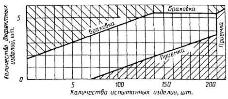 Контрольная проверка завершается, когда репрезентативная точка, отражающая протекание испытаний, попадает на диаграмме в зону приемки или в зону браковки.