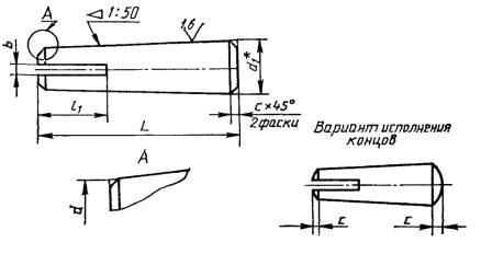 Длина штифтов L должна выбираться из следующего ряда: 40, 45, 50, 55, 60, 70, 80, 90, 100, 120, 140, 160, 200, 250 мм. Пример условного обозначения штифта диаметром d = 10 мм, длиной L = 80 мм, без покрытия: Штифт 10 ´ 80 ГОСТ 19119-80 То же, с химическим окисным покрытием, пропитанным маслом: Штифт 10 ´ 80 Хим.Окс.прм ГОСТ 19119-80 1.2. Теоретическая масса штифтов указана в приложении 1. 2. ТЕХНИЧЕСКИЕ ТРЕБОВАНИЯ2.1. Штифты должны изготовляться в соответствии с требованиями настоящего стандарта по рабочим чертежам, утвержденным в установленном порядке. 2.2. Предельные отклонения диаметра штифтов d - h10, длины L - j815, длины прорези l1 - h14, ширины прорези b - H14. 2.3. Смещение прорези b относительно оси штифта - IТ14. За номинальный размер при определении предельного отклонения следует принимать параметр b. 2.4. Предельные отклонения конусности штифтов 2.5. Неуказанные предельные отклонения размеров: до 0,3 - плюс 0,1 мм, свыше 0,3 до 1 - плюс 0,15 мм, свыше 1 мм - j8 15. 2.6. Материал - сталь марки 45 по ГОСТ 1050-88. 2.7. Штифты должны применяться без покрытия или с покрытием Хим. Окс. прм по ГОСТ 9.306-85. Технические требования к покрытию - по ГОСТ 9.301-86. 2.8. На поверхности штифта не допускаются трещины, риски, выводящие размеры изделий за предельные отклонения, заусенцы на прорези, коррозия. 2.9. Допускается при необходимости обеспечения взаимозаменяемости для применения в изделиях, спроектированных до 1 января 1980 г., по согласованию с потребителем изготавливать штифты конические разводные с допусками по приложению 2. 3. ПРАВИЛА ПРИЕМКИ3.1. Правила приемки - по ГОСТ 17769-83 для изделий повышенной и нормальной точности. 4. МЕТОДЫ КОНТРОЛЯ4.1. Внешний вид штифтов проверяют осмотром без применения увеличительных приборов. Допускается в спорных случаях использовать лупу с 2,5 - 3-кратным увеличением. Допускается проверка трещин специальными методами. 4.2. Конусность конических штифтов контролируется универсальными методами и средствами. 4.3. Контроль качества покрытия - по ГОСТ 9302-88. 4.4. Шероховатость рабочей поверхности штифтов проверяется путем сравнения с эталонными образцами по ГОСТ 9378-75 или приборам. 5. УПАКОВКА И МАРКИРОВКАУпаковка штифтов и маркировка тары - по ГОСТ 18160-72. ПРИЛОЖЕНИЕ 1