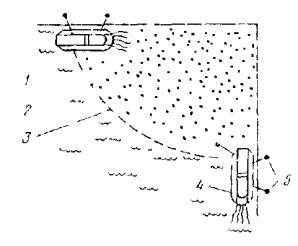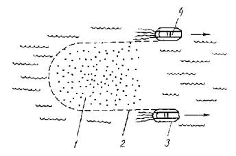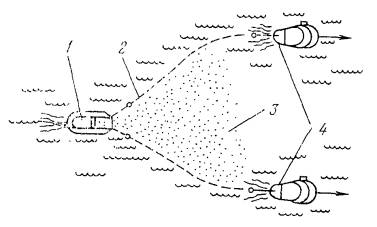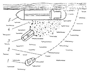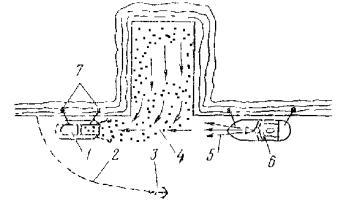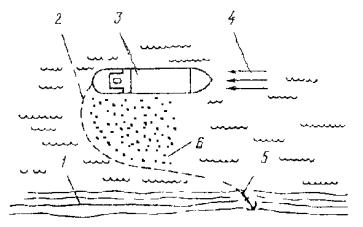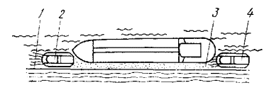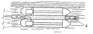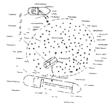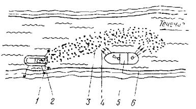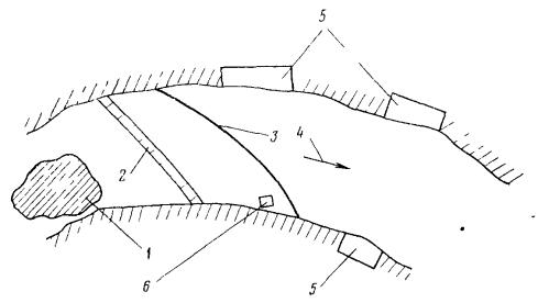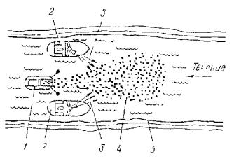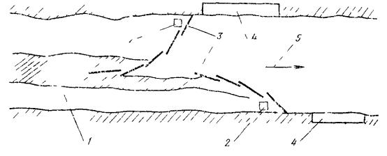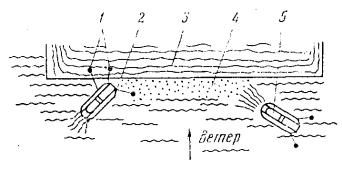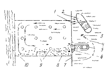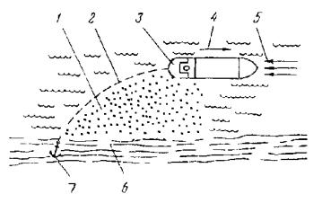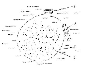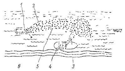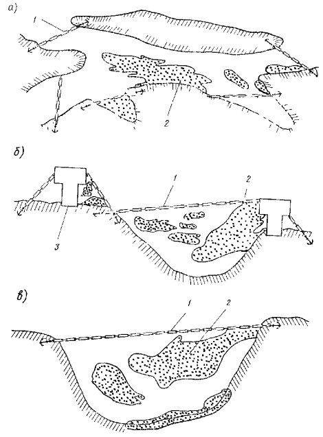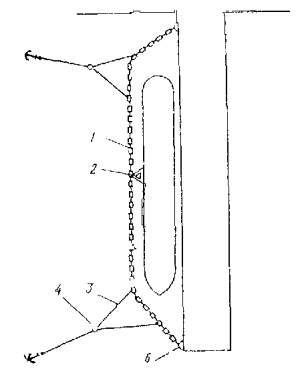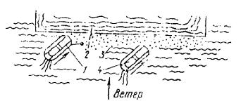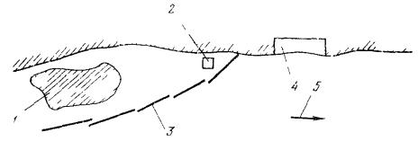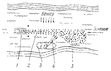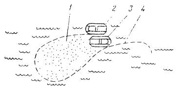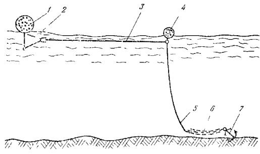 Рис. 17. Определение угла установки бонового заграждения 5.4.15. При разливах нефти на акваториях речных портов, где локализация нефти бонами из-за значительного течения затруднена или вообще невозможна, рекомендуется сдерживать и изменять направление движение нефтяного пятна судами-экранами, струями воды из пожарных стволов катеров, буксиров и стоящих в порту судов. 5.4.16. При разливе нефти из поврежденных танков в условиях течения необходимо поставить судно на якорь в стороне от судового хода, ближе к берегу, в зоне с относительно малой скоростью течения, и по возможности поврежденным бортом к берегу. Затем установить боковые заграждения по схеме рис. 18. Рис. 18. Предотвращение растекания нефти корпусом судна и боковыми заграждениями: 1 - линия берега; 2 - оперативные боковые заграждения; 3 - аварийное судно; 4 - направление течения; 5 - якорь; 6 - нефтяное пятно 5.4.17. В начальный момент разлива необходимо удерживать вытекающую из танкера нефть внутри пространства, образованного корпусом судна и боковым заграждением, не допуская загрязнения нефтью берега. При значительном разливе для увеличения размеров огражденного участка водной поверхности до предельного использования всей длины боновых заграждений судно необходимо продвинуть против течения (рис. 19). Рис. 19. Перемещение судна для увеличения ограждаемого судном и бонами участка: 1 - нефтяное пятно; 2 - оперативные боновые заграждения; 3 - аварийное судно; 4 - направление передвижения судна; 5 - направление течения; 6 - линия берега; 7 - якорь 5.4.18. При разливах нефти на реках рекомендуется обеспечивать локализацию по следующим схемам (рис 20): 1) при разливе в протоке или озере (рис. 20, а) бонами перекрываются все выходы, соединяющие место разлива с рекой, перекрываются заполненные нефтью заводи. Сформировавшееся нефтяное пятно, если оно может менять свое место при изменении гидрометеорологических условий, следует также оградить бонами; 2) при разливе в районе причалов (рис 20, б) боновое заграждение следует устанавливать ниже причала таким образом, чтобы локализовать разлившуюся нефть в углублениях береговой линии, где течение минимально; 3) при разливах у заводи (рис 20, в) боновые заграждения устанавливаются между берегами заводи таким образом, чтобы исключалась возможность выноса нефти течением. 5.4.19. Оперативные боновые заграждения на акваториях портов должны крепиться к специальным буям, установленным на якорях (рис 21). При этом: 1) для крепления боновых заграждений на акваториях портов рекомендуется применять якоря массой 10-15 кг легкие по ГОСТ 25496-82, якоря Матросова по ГОСТ 8497-78, якоря адмиралтейские по ГОСТ 760-74; 2) для соединения буя с якорем рекомендуется применять канаты капроновые с длиной окружности 40 мм (диаметром 13 мм) по ГОСТ 10293-77. Длина каната должна быть не менее наибольшей глубины в порту. При этом необходимо для увеличения держащей силы якоря между якорем и канатом предусматривать отрезок цепи калибром 9 по ГОСТ 228-79 или ГОСТ 7070-75 длиной 2-4 м; 3) буи для крепления боновых заграждений должны иметь яркую, легко различимую окраску и должны быть снабжены сигнальными огнями и радарными отражателями для наблюдения за ними при плохой видимости. Рис. 20. Схема локализации нефтяного загрязнения: а - в протоке или озере, сообщающихся с рекой; б - в районе причалов; в - у заводи; 1 - боковое загражден