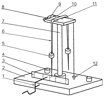 1 - пусковой механизм; 2 - основание; 3 - шкала; 4 - установочные винты; 5 - груз; 6 - двустрелочный механизм; 7 - штатив; 8 – соединительная планка; 9 - рамка; 10 - столик; 11 - стальные шарики; 12 - отвес 3.6б.2.1. Аппаратура и материалы Маятниковый прибор типа М-3 для определения твердости при комнатной температуре (20±2) °С (чертеж). Основные характеристики маятникового прибора: масса маятника (120±1) г; длина маятника, считая от точки опоры до конца стрелки, (500±1) мм; диаметр стального шарика (точки опоры) 7,938 мм по ГОСТ 3722-81; шкала прибора, разделенная на градусы; угол отклонения от 5 до 2°; время затухания колебаний на стеклянной пластинке («стеклянное число») (440±6) с. Стеклянные пластинки размером 90´120 мм, толщиной от 1,2 до 1,8 мм. Секундомер. Растворители: эфир этиловый по ГОСТ 8981-78 или ацетон технический по ГОСТ 2768-84. 3.6б.2.2. Подготовка к испытанию Перед каждым испытанием шарики маятника и стеклянную пластинку прибора тщательно протирают ватой, смоченной растворителем, а затем сухой чистой марлей. На пластинки, подготовленные по ГОСТ 8832-76, наносят испытуемую эмаль (п. 3.2). 3.6б.2.3. Проведение испытания Маятниковый прибор проверяют по «стеклянному числу» - времени затухания колебаний маятника, точки опоры которого лежат на стеклянной пластинке прибора. Определение «стеклянного числа» проводят при температуре (20±2) °С и относительной влажности воздуха (65±5) %. Измерения проводят не менее чем на трех участках поверхности стеклянной пластинки. Таким же образом определяют время затухания колебаний маятника на стеклянной пластинке с испытуемым покрытием эмали. 3.6б.2.4. Обработка результатов Твердость (Н), условные единицы, вычисляют по формуле