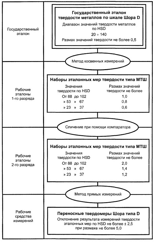 5.1.3 Рабочие эталоны 1-го разряда применяют для передачи чисел HSD рабочим эталонам 2-го разряда сличением при помощи компаратора (прибора, настроенного по рабочим эталонам 1-го разряда типа МТШ по ГОСТ 8.426). 5.2 Рабочие эталоны 2-го разряда 5.2.1 В качестве рабочих эталонов 2-го разряда применяют наборы переменного состава эталонных мер твердости типа МТШ по HSD, в которых каждая мера имеет одно значение из диапазонов, указанных в таблице 1. 5.2.2 Пределы допускаемого размаха значений твердости рабочих эталонов (эталонных мер) по HSD 2-го разряда указаны в таблице 1. 5.2.3 Рабочие эталоны 2-го разряда применяют для поверки рабочих средств измерений методом прямых измерений. 6 Рабочие средства измерений6.1 В качестве рабочих средств измерений твердости применяют переносные твердомеры Шора типа D по [1]. 6.2 Передачу чисел HSD переносным твердомерам Шора типа D осуществляют путем измерений твердости трех эталонных мер по HSD 2-го разряда. При этом результаты измерений твердости эталонных мер по HSD не должны отличаться от значений, указанных на каждой мере, более чем на ± 2,5 при размахе, не превышающем 5,0. ГОСУДАРСТВЕННАЯ ПОВЕРОЧНАЯ СХЕМА
