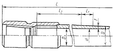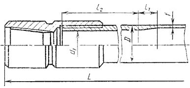 Настоящий стандарт распространяется на трубы бурильные переменного сечения из алюминиевых сплавов, изготовленные методом горячего прессования. Допускается с 1 января 1992 г. изготовлять трубы в соответствии с приложением. (Измененная редакция, Изм. № 4). 1. КЛАССИФИКАЦИЯ1.1. Трубы подразделяются по форме сечения: ТБ - с внутренними концевыми утолщениями (законцовками), черт. 1; ТБП - с внутренними концевыми утолщениями (законцовками) и протекторным утолщением, черт. 2; по виду изготовления: без нарезанной резьбы, черт. 1, 2; с нарезанной правой резьбой и с навинченными стальными замками, черт. 3; по виду прочности: нормальной прочности; повышенной прочности - ПП; по точности изготовления толщины стенки основного сечения: нормальной точности; повышенной точности - П. Трубы повышенной точности изготовляют по согласованию изготовителя с потребителем. (Измененная редакция, Изм. № 4). 2. СОРТАМЕНТ2.1. Размеры труб с внутренними концевыми утолщениями, изготовляемых без резьбы, и предельные отклонения по ним должны соответствовать указанным на черт. 1 и в табл. 1. Черт. 1 Таблица 1 мм