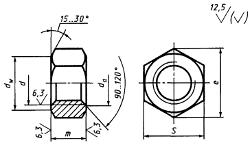 Дата введения 01.01.72 1. Настоящий стандарт распространяется на шестигранные гайки с уменьшенным размером «под ключ» класса точности В с диаметром резьбы от 8 до 48 мм. (Измененная редакция, Изм. № 4). 2. Конструкция и размеры гаек должны соответствовать указанным на чертеже и в таблице. (Измененная редакция, Изм. № 2-7). (Измененная редакция, Изм. № 2, 4). 3а. Не установленные настоящим стандартом допуски размеров, отклонений формы и расположения поверхностей и методы контроля - по ГОСТ 1759.1. 3б. Допустимые дефекты поверхности гаек и методы контроля - по ГОСТ 1759.3. 3а, 3б. (Введены дополнительно, Изм. № 5). 4. (Исключен, Изм. № 5). 5. Технические требования - по ГОСТ 1759.0. 6. (Исключен, Изм. № 2). 7. Масса гаек указана в приложении 1. 8. (Исключен, Изм. № 4). мм