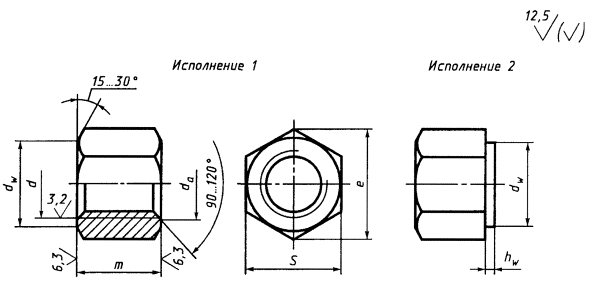 Примечания: 1. Размеры гаек, заключенные в скобки, применять не рекомендуется. 2. Допускается изготавливать гайки с размерами, указанными в приложении 2. Пример условного обозначения гайки исполнения 1 с диаметром резьбы d = 12 мм, с размером «под ключ» S = 18 мм, с крупным шагом резьбы с полем допуска 6Н, класса прочности 5, без покрытия: Гайка М12-6Н.5 (S18) ГОСТ 15524-70 То же, с крупным шагом резьбы с полем допуска 6Н, класса прочности 6, из стали марки А12, без покрытия: Гайка М12-6Н.6.А (S18) ГОСТ 15524-70 То же, исполнения 2, с размером «под ключ» S = 19 мм, с мелким шагом резьбы с полем допуска 6Н, класса прочности 12, из стали марки 40Х, с покрытием 01 толщиной 6 мкм: Гайка 2М12´1,25-6Н.12.40Х.016 ГОСТ 15524-70 (Измененная редакция, Изм. № 2, 4). 3а. Не установленные настоящим стандартом допуски размеров, отклонений формы и расположения поверхностей и методы контроля - по ГОСТ 1759.1. 3б. Допустимые дефекты поверхности гаек и методы контроля - по ГОСТ 1759.3. 3а, 3б. (Введены дополнительно, Изм. № 5). 4. Допускается по соглашению между изготовителем и потребителем изготавливать гайки с номинальным диаметром резьбы от 36 до 48 мм с шагом резьбы 2 мм. (Измененная редакция, Изм. № 2, 5). 5. Технические требования - по ГОСТ 1759.0. 6. (Исключен, Изм. № 2). 7. Масса гаек указана в приложении 1. 8. (Исключен, Изм. № 4). Справочное Масса стальных гаек (исполнение 1) с крупным шагом резьбы