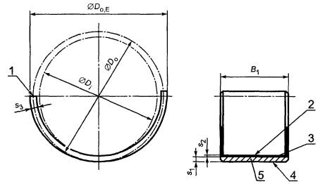 ГОСТ ИСО 3548-2002 МЕЖГОСУДАРСТВЕННЫЙ СТАНДАРТ Подшипники скольжения ВКЛАДЫШИ ТОНКОСТЕННЫЕ С БУРТОМ ИЛИ БЕЗ НЕГО Допуски, особенности конструкции и методы контроля Plain bearings. Thin-walled half bearings with or without flange. Tolerances, design features and methods of checking Дата введения 2003-07-01 1 Область примененияНастоящий стандарт устанавливает допуски, особенности конструкции и методы контроля тонкостенных вкладышей с цельным буртом номинальным наружным диаметром D0 = 250 мм и без бурта номинальным наружным диаметром D0 = 500 мм. Настоящий стандарт не устанавливает размеры вкладышей из-за большого разнообразия их конструкций. Тонкостенные вкладыши с буртом или без него применяют преимущественно в механизмах с возвратно-поступательным движением и изготавливают со стальной основой и с одним или несколькими слоями подшипникового металла на внутренней стороне. В механизмах с возвратно-поступательным движением допускается применять тонкостенные буртовые вкладыши совместно с тонкостенными вкладышами без бурта. Для альтернативного использования в качестве тонкостенного буртового вкладыша возможно применение тонкостенного вкладыша без бурта совместно с двумя упорными полукольцами согласно ГОСТ 29203 или тонкостенного вкладыша со сборными буртами. 2 Нормативные ссылкиВ настоящем стандарте использованы ссылки на следующие стандарты: ГОСТ ИСО 6524-95 Подшипники скольжения. Контроль длины развертки тонкостенных вкладышей ГОСТ 29203-91 (ИСО 6526-83) Подшипники скольжения. Прессованные биметаллические упорные полукольца. Конструкция и допуски ИСО 4288-961) Геометрические спецификации изделий (GPS). Текстура поверхности: профильный метод. Правила и методика оценки текстуры поверхности 1) Перевод - во ВНИИКИ. 3 Условные обозначенияВ настоящем стандарте применяют следующие условные обозначения: а1 - расстояние до точки измерения, перпендикулярное к плоскости разъема, мм; Acal - уменьшенная площадь поперечного сечения тонкостенного вкладыша с буртом или без бурта (расчетное значение), мм2; bH - ширина корпуса, мм; B1 - ширина тонкостенного вкладыша без бурта, мм; B2 - ширина тонкостенного буртового вкладыша, мм; B3 - расстояние между буртами, мм; C1 - наружная фаска, мм; C2 - внутренняя фаска, мм; dCh - диаметр отверстия контрольного блока, мм; dH - диаметр корпуса, мм; Dfl - наружный диаметр бурта, мм; Di - номинальный внутренний диаметр тонкостенного вкладыша с буртом или без бурта (отверстия подшипника), мм; D0 - номинальный наружный диаметр тонкостенного вкладыша с буртом или без бурта, мм; D0, E - наружный диаметр тонкостенного вкладыша без бурта в свободном состоянии (при распрямлении), мм; eв - эксцентриситет, мм; F - контрольная нагрузка, Н; Fax - осевая контрольная нагрузка для сборных буртовых тонкостенных вкладышей, Н; h - выступание, h = h1 + h2 (для контрольного метода В), мм; p - распрямление, мм; Ra - шероховатость поверхности, мкм; sfl - толщина бурта, мм; s1 - толщина стальной основы, мм; s2 - толщина подшипникового металла, мм; s3 - толщина стенки тонкостенного вкладыша с буртом или без бурта, мм; s4 - толщина стенки в основании канавки, мм; u - уменьшение толщины стенки, мм. Параметры тонкостенных вкладышей без бурта и тонкостенных буртовых вкладышей представлены на рисунках 1 и 2. 1 - плоскость разъема; 2 - поверхность скольжения; 3 - подшипниковый металл; 4 - посадочная поверхность; 5 - стальная основа Рисунок 1 - Тонкостенный вкладыш без бу