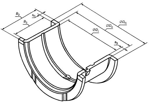 где BLu - нижний предел u; ULu - верхний предел u; s3, act - фактическое значение s3; sα, BL - нижнее значение sα; sα, UL - верхнее значение sα. Пример расчета приведен в приложении А. 4.3 Ширина тонкостенного буртового вкладыша, расстояние между буртами, наружный диаметр бурта и толщина бурта Номинальный размер ширины тонкостенного буртового вкладыша и расстояние между буртами зависят от типа применения и общего отношения B1(B2)/Di ≤ 0,5. Допуски на ширину указанных вкладышей приведены в таблице 1. Наружный диаметр бурта должен быть меньше диаметра буртика вала. В большинстве случаев толщину бурта устанавливают в соответствии с толщиной стенки тонкостенного буртового вкладыша и в общем случае устанавливают только допуск на толщину бурта на нагруженной стороне для того, чтобы верхний и нижний тонкостенные буртовые вкладыши имели одинаковую толщину буртов. В этом случае положение буртов относительно фиксирующих элементов является зафиксированным. В случае, если верхний и нижний тонкостенные буртовые вкладыши имеют одинаковую конструкцию, то обычно два бурта одного тонкостенного буртового вкладыша должны иметь одинаковую толщину в пределах поля допусков, указанных в таблице 1. В этом случае значения толщины бурта получают исходя из ширины тонкостенного буртового вкладыша и расстояния между буртами. По согласованию между потребителем и изготовителем могут быть установлены другие допуски 4.4 Распрямление тонкостенных вкладышей без бурта На распрямление тонкостенных вкладышей без бурта оказывают влияние такие факторы, как материал антифрикционного слоя, его толщина и физические свойства, материал основы и его свойства, рабочая температура сборки узла. В связи с тем, что эти особенности не устанавливаются в настоящем стандарте, значение распрямления также не регламентируется. Распрямление во всех случаях должно быть положительным. После эксплуатации механизма в нормальных условиях значение распрямления должно быть достаточно для обеспечения ремонта (восстановления). Фактическое значение распрямления устанавливают по согласованию между потребителем и изготовителем. Примечание - Тонкостенные вкладыши без бурта для механизмов с возвратно-поступательным движением обычно имеют значение распрямления от 0,2 до 3,0 мм. Для очень больших тонкостенных вкладышей без бурта значение распрямления может быть больше, но не должно быть таким, чтобы вкладыш не входил в корпус. 5 Особенности конструкцииРазмеры тонкостенных вкладышей с буртом или без бурта устанавливают по согласованию между потребителем и изготовителем, допуски приведены в таблицах 2 и 3. Таблица 2 - Минимальная высота (и ширина) перехода и скоса буртов