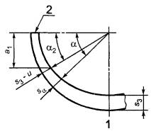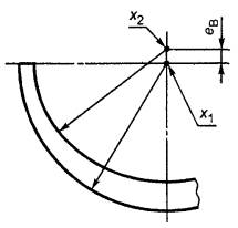 Допуски и шероховатость поверхности основы подшипника и поверхности скольжения тонкостенных вкладышей с буртом или без него с электролитическими антифрикционными слоями или без них приведены в таблице 1. Допуск на толщину стенки тонкостенного вкладыша с буртом или без него зависит от того, будет отверстие подшипника подвергнуто окончательной механической обработке или электролитической обработке без последующей механической обработки. Допустимы отдельные небольшие вмятины на поверхности наружного диаметра тонкостенного вкладыша с буртом или без него при условии, что они немногочисленны, однако в этих зонах не следует проводить измерение толщины стенки. Отверстие подшипника в собранном состоянии получается из отверстия корпуса, которое упруго увеличивалось вследствие прессовой посадки, уменьшая в два раза толщину стенки вкладыша (см. [1]). Примечание - В отдельных случаях применения используют гладкие или буртовые тонкостенные вкладыши с эксцентрическими отверстиями, т.е. когда толщина стенки вкладыша уменьшается равномерно от вершины к плоскости разъема (см. рисунки 3 и 4). Эксцентриситет eв характеризуется в радиальной плоскости расстоянием между центром x1 наружной поверхности подшипника и центром x2 отверстия подшипника, eв специально не измеряют, eв контролируют заданным значением уменьшения u, которое измеряют расстоянием а1, перпендикулярно к плоскости разъема (а1 обычно определяют так, чтобы угол α2 составлял приблизительно 25° от плоскости разъема). Это должно быть согласовано между потребителем и изготовителем. Рисунок 3 - Эксцентрическое отверстие тонкостенного гладкого или буртового вкладыша 1 - вершина, 2 - плоскость разъема Рисунок 4 - Пример толщины стенки при различных углах Границы допуска на толщину стенки вычисляют по следующим формулам: