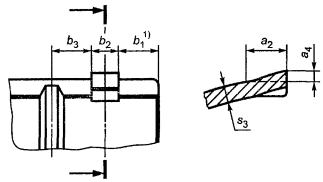 5.1 Фиксирующие выступы и пазы Обозначения размеров фиксирующих выступов и пазов указаны на рисунках 5 - 7. 1) Выступ может быть изготовлен на конце тонкостенного вкладыша без бурта, в этом случае b1 = 0. Примечания 1 b1 ≥ 1,5s3, но не менее 3 мм. 2 Если b3 < 2 мм, то эта поверхность может быть свободна от подшипникового (антифрикционного) металла в пределах кольцевой длины a2, чтобы избежать разрушения подшипникового металла, когда отверстие вкладыша подвергают механической обработке. Фиксирующий выступ может также разрушиться в смазочной канавке Рисунок 5 - Фиксирующий выступ в тонкостенном вкладыше без бурта