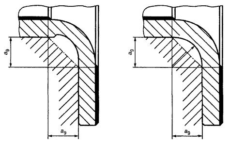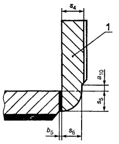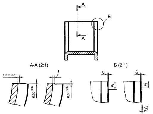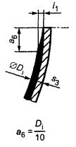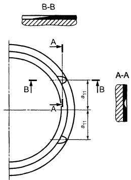 Примечание - b1 ≥ 1,5s3, но не менее 3 мм Рисунок 7 - Фиксирующий паз в корпусе 5.2 Скосы и фаски Скосы на отверстии плоскости разъема предусматривают на обеих сторонах тонкостенного вкладыша с буртом или без него по всей ширине. Для руководства рекомендуют, чтобы размер а6 составлял приблизительно 1/10 внутреннего диаметра Di, фактическое значение этого размера зависит от применения тонкостенного вкладыша и устанавливается по согласованию между потребителем и изготовителем (см. рисунок 8). Фаски должны быть предусмотрены на обоих концах тонкостенных вкладышей без буртов (см. рисунок 9). Скосы на буртах должны быть предусмотрены на всех плоскостях разъема (см. рисунок 10, сечение А-А), а также на краях поверхностей скольжения буртов (см. рисунок 10, элемент Б). Размеры и предельные отклонения даны в таблице 2. Рисунок 8 - Скос отверстия тонкостенного вкладыша с буртом или без него Рисунок 9 - Фаски а) Скос поверхности разъема б) Скос поверхности скольжения для тонкостенных буртовых вкладышей Скос поверхности скольжения для тонкостенных сборных буртовых вкладышей по ГОСТ 29203 Рисунок 10 - Скосы бурта (конструкция по выбору изготовителя) 5.3 Переход между радиальной частью вкладыша и буртом На рисунке 11 представлены типичные примеры зоны перехода, реальные используемые формы в зависимости от метода изготовления и соотношения между толщиной стенки и толщиной бурта. Рисунок 11 - Типы зоны перехода между радиальными частями 1 - Бурт s5 ≥ 66 % толщины стенки вкладыша; s6 ≥ 50 % толщины бурта, но меньше s4; угловой профиль должен всегда перекрывать бурт и толщину вкладыша следующим образом: a10 = 0,5 мм (минимум); b5 = 0,25 мм (минимум) Рисунок 12 - Тип перехода между вкладышем и буртом тонкостенного сборного буртового вкладыша Чтобы избежать растрескивания, зона перехода между радиальной частью и буртом должна соответствовать размеру а9. 1 - упорное кольцо Примечание - Зубчатая пята, способствующая максимальному использованию материала, согласно ГОСТ 29203 Рисунок 13 - Зубчатая пята сборного бурта Геометрия зоны перехода должна соответствовать форме вала, чтобы избежать загрязнения радиуса перехода и внутреннего диаметра корпуса. На рисунке 12 дан пример зоны перехода между вкладышем и буртом тонкостенного сборного буртового вкладыша. Для тонкостенных сборных буртовых вкладышей предпочтительные размеры перехода (чтобы максимизировать материал для крепления бурта) указаны на рисунке 12. 5.4 Зубчатая пята сборного бурта Эта особенность конструкции вкладыша применяется для улучшения использования материала (рисунок 13). 5.5 Смазочные канавки и отверстия Типы и расположение смазочных канавок, отверстий и карманов представлены на рисунках 14 - 17. Размеры смазочных канавок, отверстий и карманов устанавливаются функциональными требованиями и не приведены в настоящем стандарте. Предпочтительные формы канавок в радиальном направлении приведены на рисунке 14. Смазочные канавки и смазочные карманы на поверхностях бурта вырезают в стальной основе подшипникового металла и используют на буртах с наружным диаметром Dfl до 160 мм. При больших размерах допускается использовать другие формы канавок или карманов. Смазочные отверстия высверливают или пробивают. В обоих случаях следует скруглить острые кромки и снять заусенцы на смазочных отверстиях, за исключением зоны перехода к см